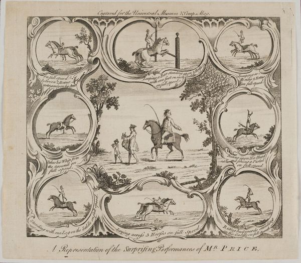 Curator: This watercolor painting, attributed to Giovanni Volpato, is titled "Soldiers in a battle for a fort" and dates back to the 18th century. It’s currently held in the Rijksmuseum. Editor: My initial impression is a dynamic yet somewhat theatrical scene. The pale colors and ornate border give it an almost dreamlike quality despite the violent subject matter. Curator: Indeed, the composition strikes me as intentionally constructed, almost like a stage set. Note the disposition of figures – their gestures, colors, clothing – to suggest dynamism and evoke emotional reaction, almost operatic. Consider the impact of those material choices and artistic arrangements upon a contemporary European audience accustomed to courtly Baroque splendor but also rapidly urbanizing commercial life. Editor: I see your point. Let's not overlook that ornamental border, almost too flamboyant. It contrasts strikingly with the stark subject matter of soldiers battling it out for control of what appears to be a fort. Curator: The ornamental framework speaks to me of patronage and function as luxury object: who commissioned it, where would it hang? And for whom was the visualization of violent subjugation pleasurable or desirable to possess in the domestic sphere? The technique, employing watercolor, would likely permit reproducibility: multiples for circulation perhaps. What were the material constraints, what was readily to hand, in the context of production? Editor: Good questions! Regarding composition: my attention is drawn to the group struggling on the ground. The artist skillfully utilizes a cluster of bodies, contorted shapes, and contrasting hues—greens against the reds—to build that specific focal point amid chaos. It feels both dramatic and carefully balanced. Curator: Agreed. Also consider the fort in the distance. What strategic resources are under dispute and the social cost of their requisition in military conflicts such as that visualized? The materiality of conflict... I’m seeing now a potent ideological dimension to the artwork itself. Editor: And a curious aesthetic tension too. I find it almost seductive due to its artistry. Thank you for unveiling new aspects within it. Curator: A pleasure. It just confirms how crucial different viewpoints are when analyzing cultural artefacts and interpreting past realities of material existence.