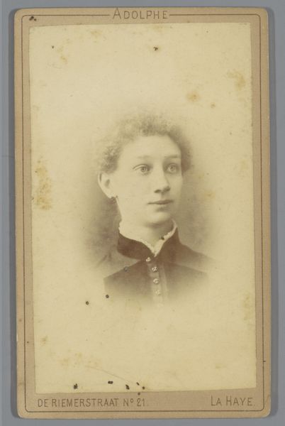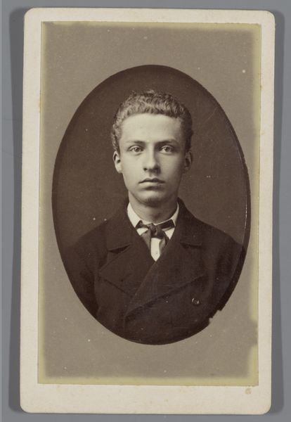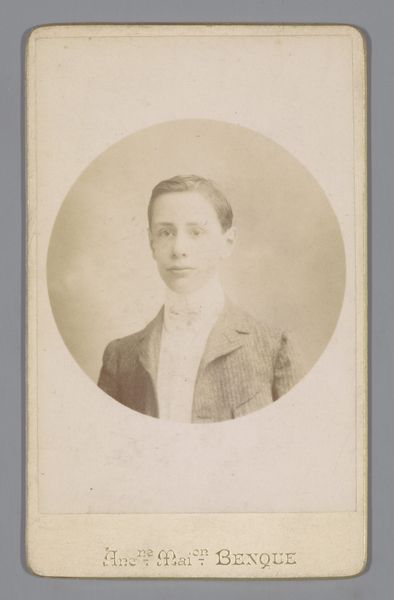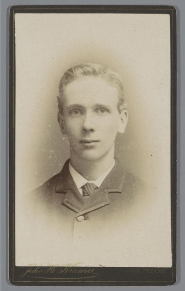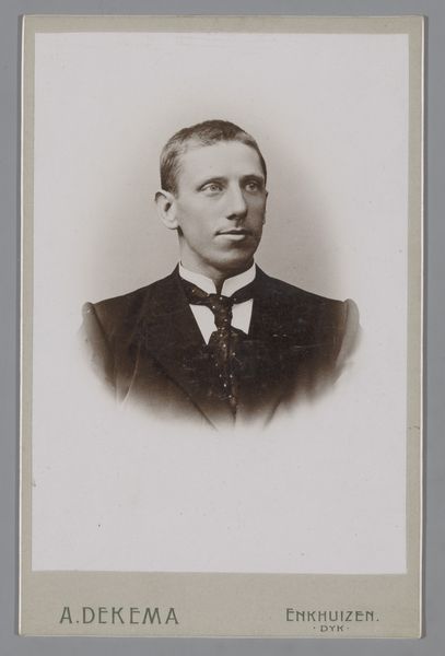 Curator: The overall impression is striking—there's a cool formality that pervades this photographic portrait. The composition is so simple: a centrally located figure with a symmetrical balance that feels very composed. Editor: I agree. It exudes an almost austere self-possession. This silver gelatin print, dating from 1896 to 1900, is catalogued as “Portrait of an Unknown Man,” by Ritscher & Landsman. The anonymity adds to the air of mystery, doesn't it? Curator: Absolutely. And looking at the formal structure, I see the soft focus that makes it feel both immediate and strangely distant. The chromatic range from the paper to his suit focuses the gaze centrally toward his pale complexion, giving his eyes a luminous intensity. It really encapsulates a tension of representation and abstraction through careful tonal manipulations. Editor: It really is a moment captured and imbued with a certain power. What strikes me is how this type of portrait, especially around the turn of the century, became so essential in crafting a desired image, solidifying one’s place within the social order. Curator: Precisely, the subject’s tailored suit and meticulously arranged tie are not incidental. The patterned fabric introduces depth against the uniformity, acting like a textual break amidst the tonal continuities of greyscale—offering a glimpse into an implied narrative or persona. Editor: Right, each choice here projects an unspoken aspiration, almost demanding interpretation. Consider how portraiture functioned in the late 19th century—beyond mere documentation, these were symbols that reflected cultural norms. And by possessing the financial and social position to sit for a portrait—we read a clear social indicator. Curator: In that light, examining its visual form through photographic and chromatic decisions elevates it from a relic to an articulation of an ephemeral, individual existence through artistic intention. Editor: Anonymity notwithstanding, reflecting on it through its historical context deepens our connection to those shared, though unseen, hopes and desires—a pursuit that enriches our humanity.