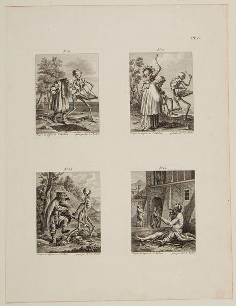 Curator: Cornelis van Noorde’s print, dating from before 1767, is entitled "Voorzichtigheid is de moeder van de wijsheid / Apotheek / Christus biedt genade en vrijheid aan / Geboorte van Christus." It’s an engraving. Editor: The composition, split into four distinct scenes, feels unusual. Each quadrant, a self-contained narrative. How would you analyze the formal elements and their relationship to the overall composition? Curator: Let us first observe the disposition of light and shadow, noting how each quadrant employs distinct tonal ranges to demarcate space and emphasize focal points. Note also the meticulous rendering of line, evident in the depiction of architectural forms and human figures. What significance might we ascribe to the deployment of these elements? Editor: It seems each scene has a different focal point achieved through lighting. What about the use of line – does that direct our eye in a particular way? Curator: Precisely. The convergence of lines often leads to areas of thematic importance, inviting close scrutiny of the relationships among objects and figures within each panel. Do you find recurring compositional devices or symmetries within the broader structure of the print? Editor: Now that you mention it, the upper and lower panels mirror each other in terms of narrative direction - almost as if there's a deliberate parallelism being established? Curator: An astute observation. Note, as well, how this structure prompts inquiry into the structural relationships among the thematic content of each scene, furthering dialogue about art's symbolic potentials. Considering what we know about Baroque art and art theory, we should now look into each individual image. What could the relations be between images that use natural landscapes vs interior spaces. The Apotheek versus Christus image offers opportunities for analyzing perspective and foreground focus... Editor: Thank you. I never would have picked up on those more subtle structures! The composition seems a lot more complex now.