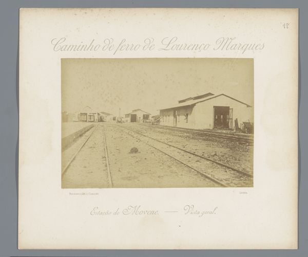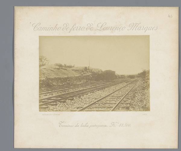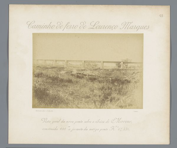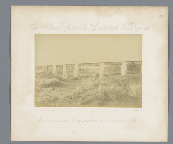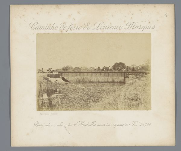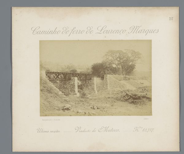 Curator: Welcome. Let's explore this albumen print from around 1889-1895, titled "Tijdelijke brug over de Rio Movene in Mozambique," created by Manuel Romão Pereira. What are your first impressions? Editor: Well, it’s a photograph of a temporary bridge in what looks like a very desolate landscape. The tonality is very sepia-toned and it has quite a rough and immediate aesthetic, despite probably being carefully posed. How do you interpret this work formally, considering the composition and photographic technique? Curator: I see it as a study in contrasts, primarily. The photograph, an albumen print, is inherently an exercise in manipulating light and shadow. Notice how the strong horizontal of the bridge is bisected by the structural beams creating an almost chaotic interplay. Does that controlled asymmetry say anything to you? Editor: Yes, actually! The rough textures of the wooden bridge combined with what looks like the rather rudimentary and temporary nature of the whole construction contrast dramatically with the very precise and meticulous process of albumen printing. Do you think the albumen printing flattens and obscures or enhances the textures and details within the landscape? Curator: I would argue the albumen printing allows a sharpness that is quite striking when considering its age. The detail in the supports, for instance, reinforces the overall structure. Moreover, look at the shallow depth of field which is also a characteristic aspect. Considering its use, do you feel it aids or detracts from the narrative as such? Editor: I suppose the focus is directed very clearly to the bridge itself and suggests the bridge is more important than its context, therefore drawing our eyes into its formal qualities and structure, and therefore adding to a sense of its precariousness! Thanks. I really like how you focused on how technique informs the entire visual dynamic here. Curator: Indeed. Hopefully, this detailed look has been rewarding and enriched your perspective on the relationship between form and content.