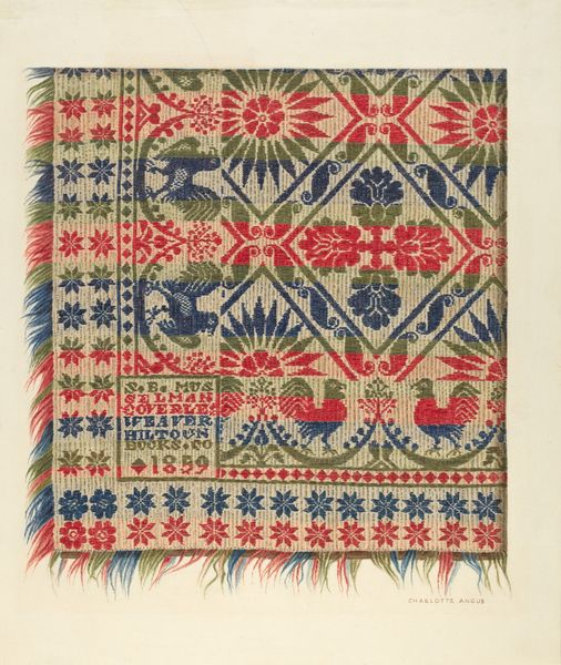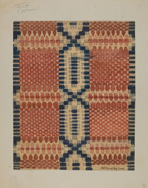 Editor: Here we have *Coverlet Detail*, created around 1936, it is a drawing showcasing a fibre-art textile design. The piece has an almost meditative quality, stemming from the geometric patterns. It feels very handmade and homey. What is your take? Curator: Oh, "homey," I like that. It's funny, I look at that tight geometry against those wild, hanging threads, and it strikes me as a conversation. I find it fascinating that this level of care was given to something as functional as a coverlet. Makes me wonder who was supposed to see it. The person wrapped in it? Or someone more discerning? Editor: Maybe both? A quiet act of artistry woven into everyday life? I hadn’t thought of it that way. What else catches your eye? Curator: Definitely the colour choices, it's restrained, but in the best way. The pops of brick-red set against the deep blue, give it such a dynamic energy. And how meticulously it's all rendered...makes you think about the patience, the quiet hours that went into creating this vision. Did the artist consider themselves an artist, or a craftsperson? Does that even matter, now, decades later? Editor: It’s beautiful! Seeing how those "crafts" can convey deep and expressive creative experiences makes me appreciate this textile piece in new ways! Curator: Absolutely! The dialogue between control and abandon...makes this more than just a drawing of a coverlet. It is, perhaps, an invitation to wrap ourselves in the unexpected beauty of the mundane. Editor: That is an elegant way to summarize the dialogue between beauty and simplicity. Thanks!