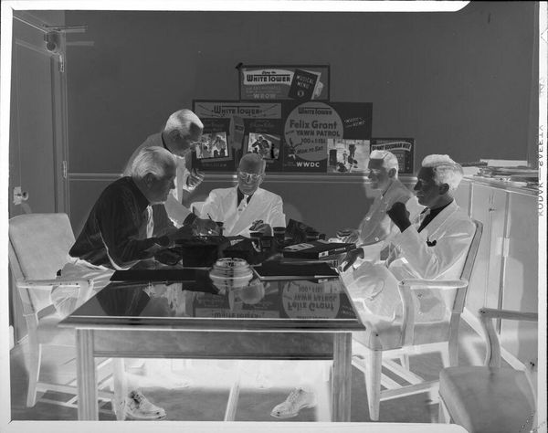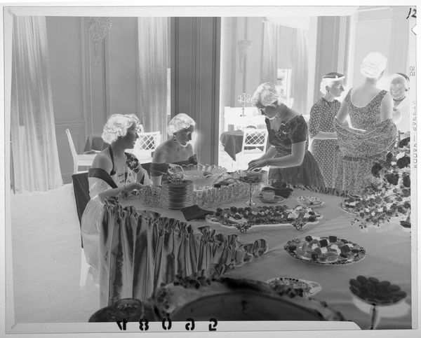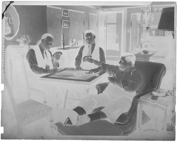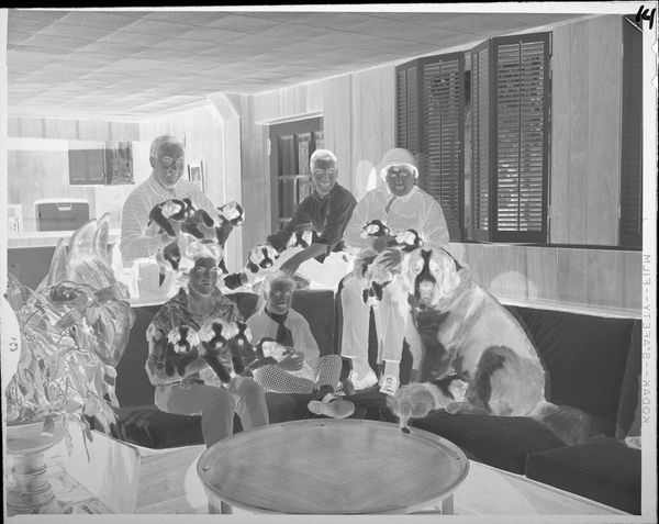 Curator: This photograph, simply titled "Untitled (family in living room with many puppies)," was created by Lucian and Mary Brown. It's a modest-sized silver gelatin print, measuring roughly 10 by 13 centimeters. Editor: My initial impression is one of overwhelming sweetness! It's a tableau vivant of multi-generational affection—and, yes, many, many puppies. Curator: The presence of so many identical puppies almost gives it the feel of a symbolic multiplication—fertility, perhaps, or the overflowing nature of family itself. Editor: Or maybe it’s just a funhouse mirror reflecting back at us, distorting our expectations of domestic bliss. Makes me wonder about the real story behind all those identical pups. Curator: The photograph does raise questions. The family's expressions are somewhat inscrutable, which contrasts with the clear abundance of puppies. It's a curious dynamic. Editor: It's charming, unnerving, and deeply weird all at once. Definitely leaves you with more questions than answers, doesn’t it?