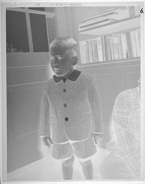 This is a photograph, a portrait of a boy with a measuring tape on his coat, by an artist called Robert Burian. In this black and white shot, Burian's approach to light is key, with the negative image allowing the viewer to really focus on tonal variations. The material quality is interesting, because, of course, it's a photograph. It has a certain flatness to it, but within that, there’s detail in the boy's striped coat, the shiny bow tie, even the measuring tape on his lapel. It gives it a strong, tactile presence. Look closely at the boy's eyes and smile; Burian uses the negative image to create an unnerving visage, something strange and otherwordly. It reminds me a little of Diane Arbus, actually, but with a kinder feel. Like Arbus, Burian highlights the beauty in the mundane, and reminds us that art is a constant conversation between artists, across time and space, about how we see and experience the world.