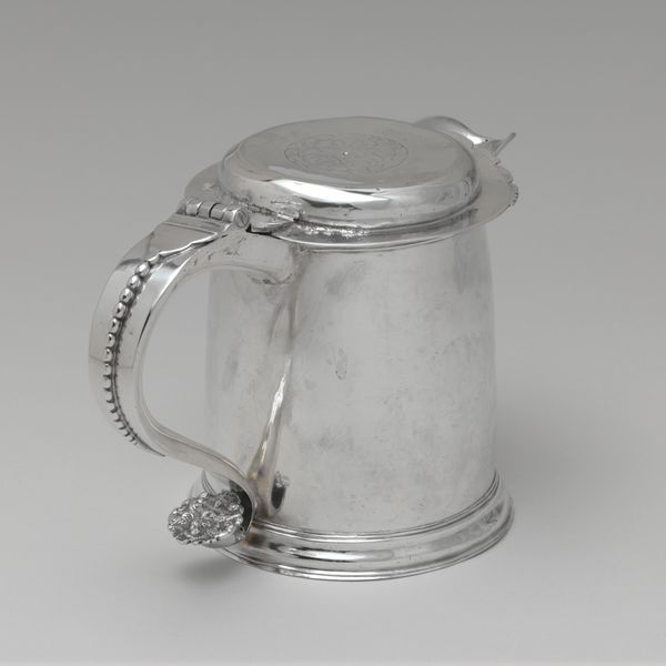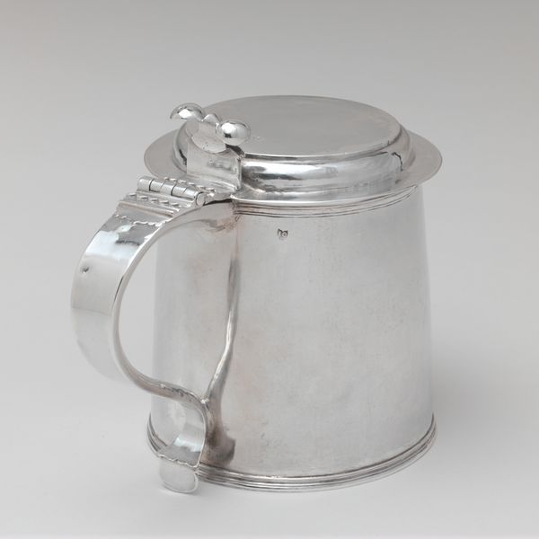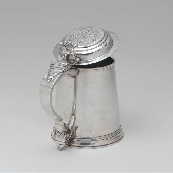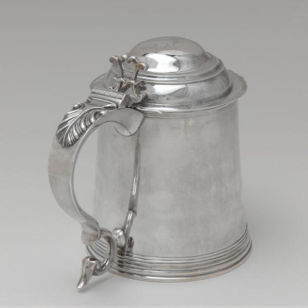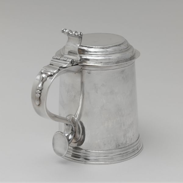 Editor: Here we have a silver Tankard crafted by Gerrit Onckelbag between 1700 and 1710. It’s currently held at the Metropolitan Museum of Art. The reflective quality of the silver is quite striking, and I’m curious about how its design contributes to its overall impact. What strikes you most about the formal aspects of this piece? Curator: The composition presents a study in contrasts. Notice the juxtaposition of the cylindrical body with the ornate detailing – the floral motifs on the handle’s base and the etched design on the lid, all suggesting different textures on the surface. The handle itself, observe its smooth, looping form as it interrupts the otherwise strict geometry. Do you see how the reflections play across the surface, too? Editor: Yes, I see that contrast now! The handle is indeed quite sculptural compared to the main body of the tankard. It almost feels like two different artistic languages at play. But is it intentional? Is the Baroque emphasis on dynamism reflected in this? Curator: Precisely. The maker manipulated light and shadow across the reflective surface. The contrast is designed to heighten visual interest. Look at how light glances off the curve of the handle compared to the flat planes of the body. That variation adds a kinetic energy. What function could be encoded within this tension? Editor: Hmm… perhaps it mirrors the lively social rituals, like drinking and toasting, for which the tankard would have been used? Or that a well crafted design will create that very excitement? Curator: Exactly! The designer successfully employed that aesthetic principle. A design’s ultimate goal, especially that of useful art, lies not only in utility but also in creating the sensory experience. Editor: This formal approach gives me a whole new level of understanding. Curator: Analyzing form guides us to deeper meaning within the art.