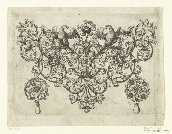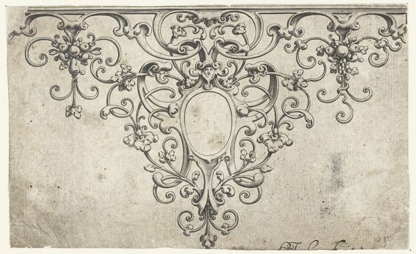 Editor: Here we have an ink drawing titled “Vignet met een ornament met bloemen,” or “Vignette with an ornament with flowers” from the 17th century, by an anonymous artist. The precision of the drawing style is quite appealing to me. What can you tell me about its place in art history? Curator: Well, its function within society is really the key. Consider that, in the 17th century, these kinds of ornamental designs weren’t just decorations. They were vital visual language. How do you think such ornament books might have shaped artistic expression beyond the printed page? Editor: That’s a good question. Maybe it was to democratize art or, at least, artistic expression, by disseminating patterns for artisans. Curator: Precisely. And where do you think these patterns were used? Think about the explosion of decorative arts at that time. Editor: Everywhere! Textiles, furniture, even architectural details. So, it served as a pattern for the production of luxury items. It reminds me of the mass production and consumption of images in our modern world, and how social media posts shape our perceptions and behaviors. Curator: It is! What is fascinating is how something intended for use as a commercial pattern gained value over time as an object worthy of study. In what other ways have images and artwork moved from private use and creation into a gallery or museum space for a larger audience? Editor: Now that’s a good question to ponder as I leave here. Thanks. Curator: My pleasure. It is always useful to consider art from both an aesthetic point of view, and its broader implications as a commodity.