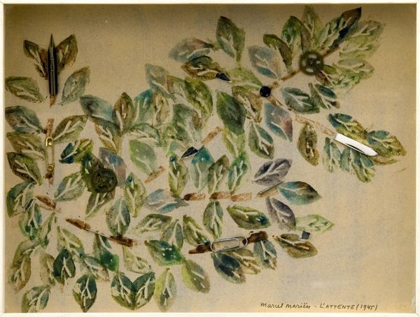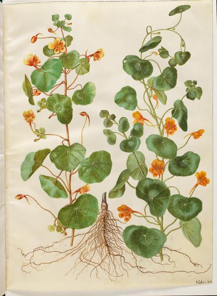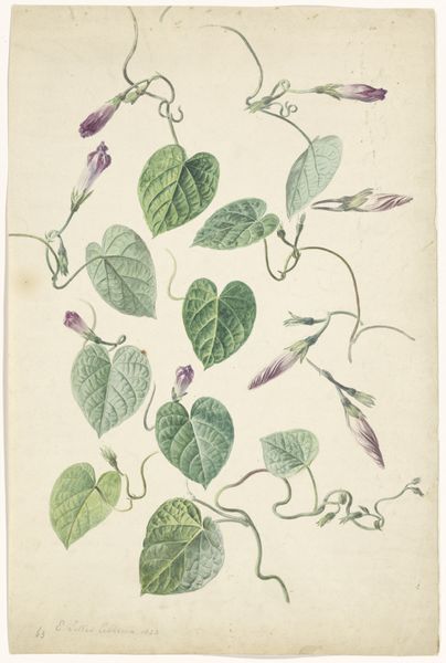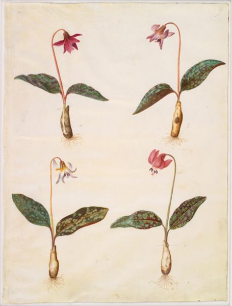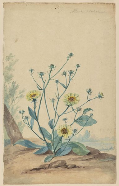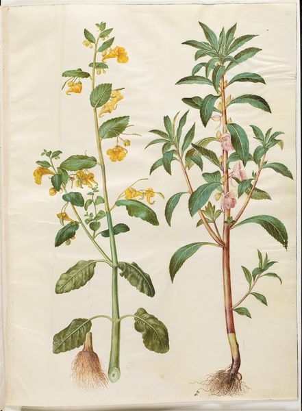 Editor: Here we have "Cerinthe major (stor voksurt)" by Hans Simon Holtzbecker, dating from 1649 to 1659. It's a botanical study using watercolors and gouache, currently residing at the SMK in Copenhagen. What strikes me immediately is the plant’s robust form, rendered with such delicate detail. What compositional choices do you see in play here? Curator: Consider the artist’s masterful arrangement of forms. Holtzbecker eschews traditional perspective, presenting the plant almost as a specimen, flattened yet bursting with vitality. Note the sharp delineation between the leaves and flowers, and how the root system anchors the composition. Do you see a visual rhythm established by the repeating shapes and varied coloration? Editor: I see how the leaves create a pattern, but there's also a tension between the linear stems and the more organic shapes of the leaves and blooms. The limited color palette also seems deliberate. Curator: Precisely. The strategic use of color creates emphasis. Notice the cool blues and greens dominating the leaves, contrasting with the warmer yellows and reds in the floral elements. These contrasting hues serve to highlight the botanical details. Holtzbecker compels the viewer to observe each detail with scrutiny. How does this objective observation contribute to the overall aesthetic effect? Editor: It’s almost like a scientific record but presented with such artistry that it transcends pure documentation. I initially missed the subtleties, but examining the piece through a formal lens really makes the artistic intention clearer. Curator: Indeed, focusing on the structural and compositional elements unveils layers of meaning. By analyzing color, form, and line, we can appreciate Holtzbecker’s technical skill and his keen observation of the natural world. I also appreciate how looking closer unlocks hidden patterns. Editor: Absolutely. It underscores the value of a rigorous approach to appreciating art!