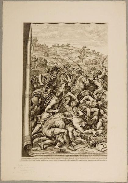 Editor: This is "Marcus Velleius Paterculus receives trophy weapons as a Roman general," made between 1681 and 1719 by François van Bleyswijck. It's a pen and ink drawing and engraving. It feels very... theatrical. Almost like a stage set with all these figures and classical architecture. What stands out to you? Curator: Immediately, I’m struck by the density of symbols layered upon one another. Consider the seated general, almost enthroned, contrasted with the chaos erupting below. The war trophies are more than spoils; they are visual testaments to power, yes, but also to the cyclical nature of conquest and dominance. Do you notice the allegorical figures mixed in with historical representation? Editor: I do, like the figure of Roma, offering the trophy. Are those specific references meant to tell a story beyond just the image of victory? Curator: Precisely! Each element—the broken columns, the embracing figures, the she-wolf—resonates with broader cultural meanings rooted in Roman mythology, history, and the fluctuating fortunes of empires. The image operates as a microcosm, compressing narratives of glory, sacrifice, and ultimately, the impermanence of earthly power. How does that reading affect your initial "theatrical" interpretation? Editor: It makes it heavier, more… laden with meaning than I first thought. It’s not just a show; it’s a commentary on history itself. Curator: Indeed. Bleyswijck is engaging in a visual dialogue with the past, using recognizable symbols to evoke shared memories and moral reflections. What does it suggest about the role of visual imagery in constructing our understanding of history? Editor: I guess I see how much images can carry, acting as shortcuts to deeper, more complex understandings of our world and our history. Thank you!