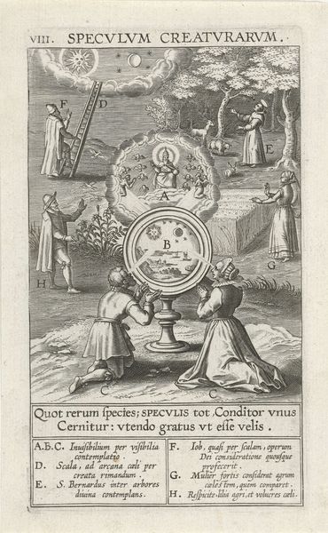 Curator: This engraving, "Spiegel der reinheid" from 1610 by Theodoor Galle, housed at the Rijksmuseum, depicts an elaborate scene filled with figures and symbolic cleansing rituals. Editor: The level of detail is impressive for an engraving. All of these people performing various ablutions, almost like stations of purification. What's striking is the labor that's implied, not just in the act depicted, but the actual making of the print itself. I see all this work, but what *are* we looking at here? Curator: Exactly! We’re seeing not only a representation of religious practice, but also the result of intense, skilled labor through Galle’s process. Consider the materiality of the engraving: the copperplate, the acid etching, the printing press, and the distribution networks needed to disseminate such images. How do these material conditions influence its meaning? Editor: So the *process* of making the engraving is just as important as what's depicted? Like the way the act of repentance might be more important than just saying you’re sorry? Curator: Precisely! Look at the large basin, it’s ornamented, monumental. Who created the models Galle worked from? What was his relationship with the craftspeople involved in these processes? Think about the skilled artisan translating theological concepts through a physical process of labor and consumption of materials. Editor: It’s like the artwork itself is a physical manifestation of religious labor. So we’re considering the work *in* the work? Curator: We are indeed. By focusing on the means of production, we reveal the socio-economic conditions shaping religious expression in 17th-century Netherlands. Editor: That really changes how I see this engraving, it’s not just religious iconography. It's also about the culture and work surrounding it. Curator: Agreed. By connecting the dots between materiality, production, and context, we get a far richer understanding of this baroque piece.