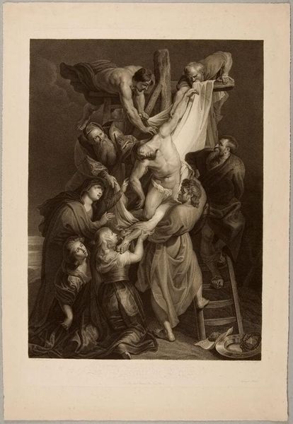 Editor: This is Lorenzo Zucchi's "Marriage of Saint Catherine," made sometime in the 1700s. It’s an engraving, so the lines are incredibly precise, but it feels crowded. What do you see in the production of this print? Curator: The printmaking process itself – the labor, the tools, the press – becomes central. Consider the social context: who was commissioning these prints, and for what purpose? The coats of arms tell a story. Editor: So, it’s less about the religious aspect and more about the social and economic forces at play in its creation? Curator: Precisely. How does the materiality of the print – the paper, the ink – affect its reception and consumption by different audiences then and now? Editor: I never considered it from that angle before. Thanks! Curator: It’s another way of understanding the cultural work an artwork performs.