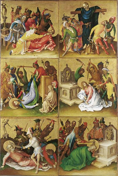 Curator: Before us is Fra Angelico’s "Scenes from the Life of Christ", completed around 1452. It's a tempera and fresco painting, currently residing in the Basilica di San Marco in Florence. Editor: Oh, it feels like a meticulously crafted storybook! So many compartments. The color palette is gorgeous, very soft, pastel-like almost, but with an intensity underneath. What a world to step into! Curator: The format is important. As a narrative piece, it really draws on the tradition of predella panels in altarpieces. The individual scenes aren't just snapshots; they're part of a larger material and devotional apparatus. Notice how the architecture connects one scene to the next. Editor: I do! It's like watching a play unfold with interconnected stage sets. And each little vignette holds so much emotional weight! I am struck by the Wheel of Fortune image; the faces are almost scary. Is that the intent, a warning? Curator: Consider the economic support required for such a project. The Medici family's patronage was essential, which suggests complex intersections of religious devotion, social status, and artistic production within the Florentine workshop system. Editor: Absolutely, you sense that power. But stepping back again, each miniature world makes you pause and wonder about the individual moments. And the figures feel incredibly graceful and human. Is it tempera that makes this possible or is that Angelico´s own signature technique? Curator: Tempera allows for that fine detail, yes, those delicate lines... but you see Fra Angelico using gold leaf very sparingly, focusing instead on the subtle gradations of color to create form. These are deliberate choices rooted in the craft traditions he inherited and then skillfully adapted. Editor: I guess that’s where the emotionality lives. Even in such small scale. It´s not ostentatious, it speaks in soft volumes that manage to capture the depth and breadth of Christ´s existence here. Curator: Exactly. Considering its context in the monastery, it was meant for quiet contemplation, a material meditation accessible every day. Editor: And that makes it more powerful. Sober. Even humbling in a sense. Curator: Indeed, seeing art through the lens of production and patronage offers a deeper appreciation of its intended use and societal impact. Editor: And getting lost in its story... that brings its intention into being.