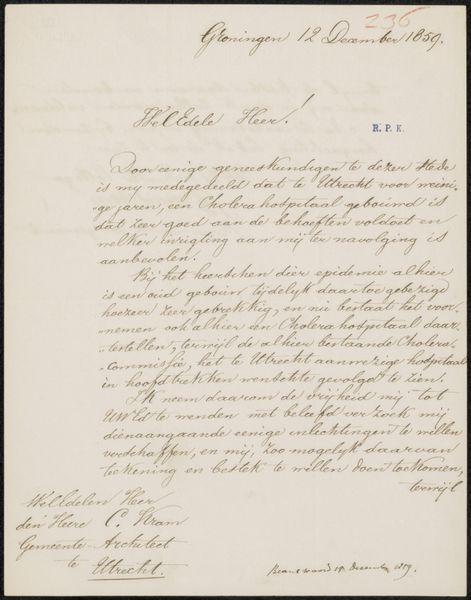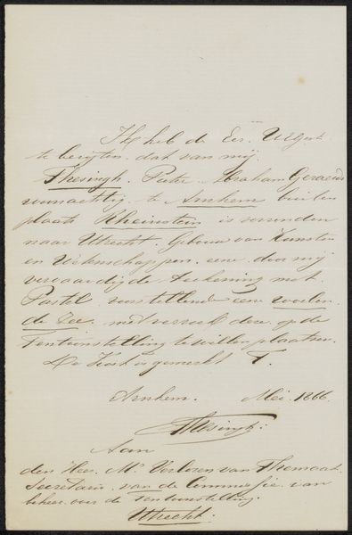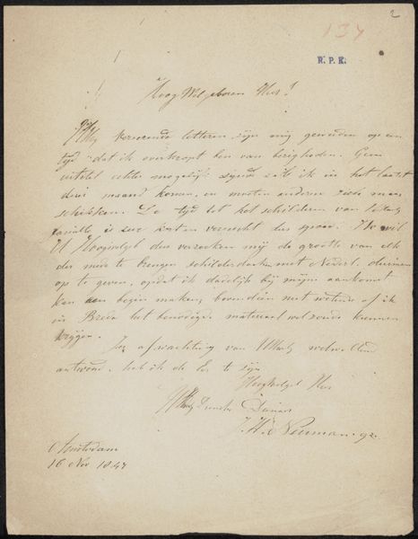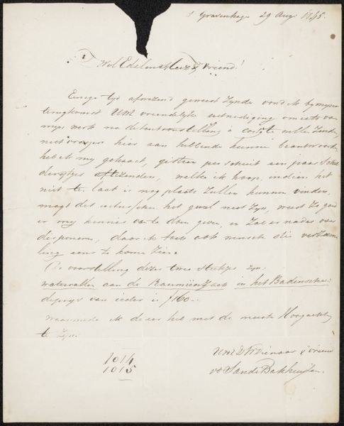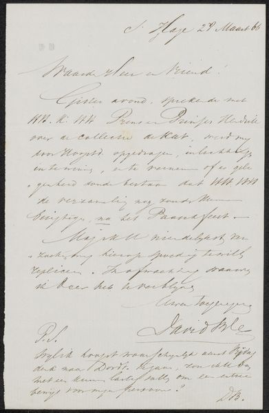 Curator: This work, "Brief aan Jan Weissenbruch," possibly from 1847 by Carl Joseph Fodor, presents an intriguing artifact of correspondence using pen and ink on paper. Its impact arises not from pictorial representation, but textual form. Editor: It really emphasizes the textures of the writing on this piece of paper. The shapes are almost like miniature abstract art, how do you see that fitting into a wider art landscape? Curator: Consider the calligraphic quality, the modulation of line weight and the sheer act of mark-making. Here, the arrangement on the page functions as a visual composition, the artist creating micro-aesthetics. Ask yourself, how do the ascenders and descenders, the letter spacing and kerning work in symphony? Editor: So it's more about appreciating the form of the text itself? But what does the message add to this? Curator: Indeed. The linguistic meaning does not obstruct our consideration of pure, non-objective visual design and artistic endeavor. Think, then, if we can disregard semantic interpretations and scrutinize its materiality and compositional balance. What about negative space against positive elements, how do those interweave? Editor: That’s a completely different perspective from how I usually consider letters! I had always thought about historical context, or who wrote this. Focusing on the art side instead really opens my eyes to new forms. Curator: Precisely. Art exists beyond image making alone; its language permeates the written world too. This letter serves as a potent reminder.