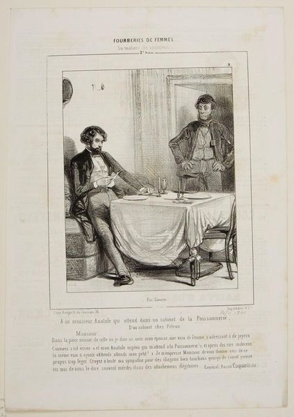 Editor: So, this is a print by Paul Gavarni, and the title is quite a mouthful: "But Doctor, you're mistaken! It's only been six and a half months . . .!" It's a comical scene, but the doctor's expression seems almost… sinister. What do you see happening here, beneath the surface? Curator: Ah, yes! Gavarni, with his light touch, often held a mirror to society's foibles. I see a clash between science and nature, perhaps even poking fun at medical authority. The frazzled patient seems to be challenging the doctor, questioning his pronouncements. The question is: what is the truth? Editor: So, it's not just a funny scene; it's social commentary? I never would've picked up on that! Curator: Exactly! Art often whispers secrets, and the more we look, the louder they become. I love that you noticed the expressions—that's a start! Editor: I'll remember that!