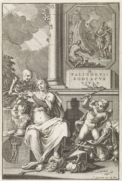 Editor: So, this is "Vrouw in Grieks gewaad," or "Woman in Greek Robe," an engraving from 1715. It's a bit different from what I usually study; the stark lines and monochrome create a strangely haunting atmosphere. What draws your eye when you look at it? Curator: It's funny you say "haunting." It whispers tales of layered artistry. The composition’s a play—see how the figures, with that classic Baroque flourish, frame the text, turning words into images and vice versa? The woman, draped and poised, seems almost a muse. But, notice the little cupid there? To me, it's mischievous; a hint that this ‘heroic epistle’ is about to get a bit complicated. Editor: Complicated how? I was mainly struck by the technical skill of the engraving, the detail they got with just lines... Curator: Think of the source material, Ovid’s "Heroides"—letters from mythological women to their absent lovers. Now consider, Amsterdam 1715. Isn’t there something subversive, presenting passionate women’s voices when societal expectations were rather different? Do you get the impression it could be read with various… let’s say, rebellious undercurrents, back then? Editor: That’s a great point; I hadn't really considered that! So, it’s not just a pretty picture; it's part of a conversation. Curator: Exactly! Every flourish tells a story, a dialogue between artist, writer, and, yes, even us, centuries later. Editor: This makes me want to explore other engravings and Baroque art more in depth! It also goes to show how every work of art is a record of its time and the artists reflection. Curator: It’s all connected, every line, every shadow. The beauty lies in unraveling it all.