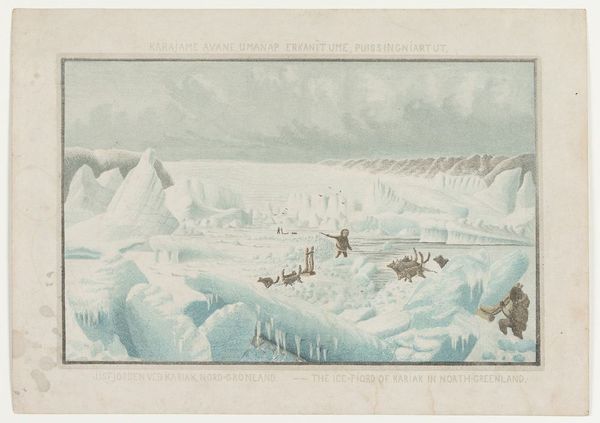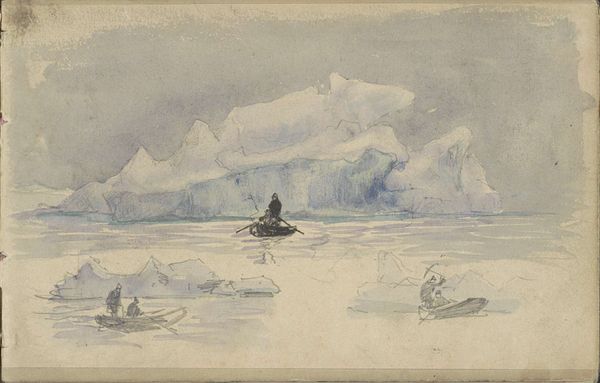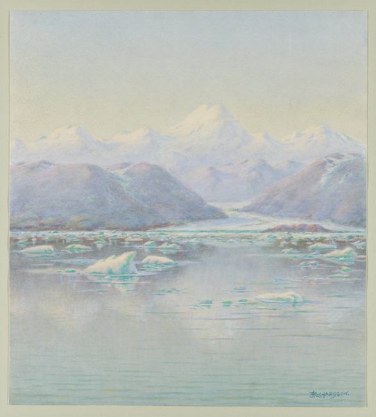 Curator: What a spectral, almost dreamlike vision. It feels profoundly silent. Editor: Indeed. We’re looking at “Morning at Muir Glacier,” a watercolour made circa the 19th century by Theodore J. Richardson. It currently resides here at the Minneapolis Institute of Art. Curator: Watercolour is perfect. That translucent wash captures the ethereal quality of the scene. It’s as if the paint itself is ice, suspended in a glacial melt. I love how the palest blues and grays dominate. Editor: The composition is fairly straightforward—a horizontal division into three distinct bands: water in the foreground, a vast glacial expanse in the middle ground, and distant, snow-capped mountains completing the backdrop. The layering of these bands creates a clear sense of depth, drawing the eye into the serene vista. Note Richardson's calculated placement of light, subtly guiding us through the complex icy topography. Curator: Yes, it’s serene, but also...imposing. It’s humbling to consider the sheer scale and the deep freeze that must have gripped the artist when creating this. Makes me want to grab a hot chocolate! Editor: And think about the stylistic choices. This has the feeling of plein-air painting, but through the lens of impressionism. Quick brushstrokes and attention to capturing light's fleeting effects...he definitely prioritized sensation over meticulous detail. Curator: Exactly! He's chasing after a feeling, not documenting geographic accuracy. I wonder if that lone iceberg floating in the foreground is symbolic—perhaps an emblem of isolation, or a reminder of nature's ephemerality? Editor: Semiotically speaking, one could interpret the iceberg as a visual signifier of change and fragility, echoing larger environmental concerns relevant even then. This connects, of course, to Romanticism's reverence for raw Nature. Curator: Well, whatever he was trying to "say," for me it conjures a powerful longing. The yearning to be both dwarfed and held by something greater than myself. Editor: Yes. It truly demonstrates how through a mastery of light, tone and formal composition, an artist can transmit a sense of sublimity that truly resonates, making “Morning at Muir Glacier" much more than simply landscape art. Curator: Agreed. So, until next time, keep seeking those moments that expand you—be they found in glaciers or your local coffee shop.