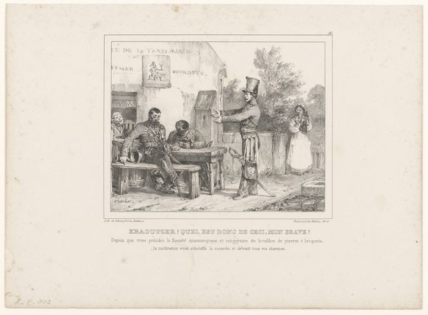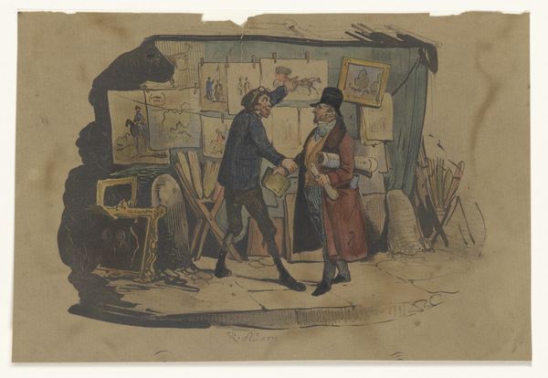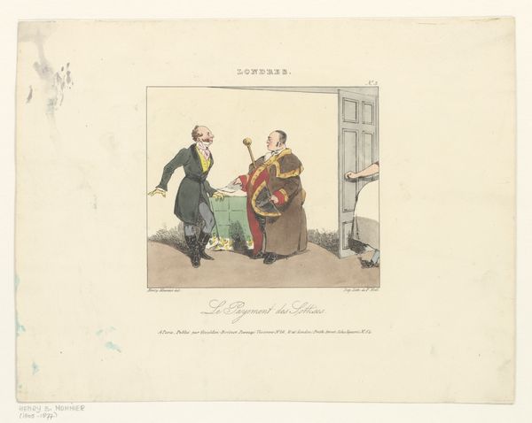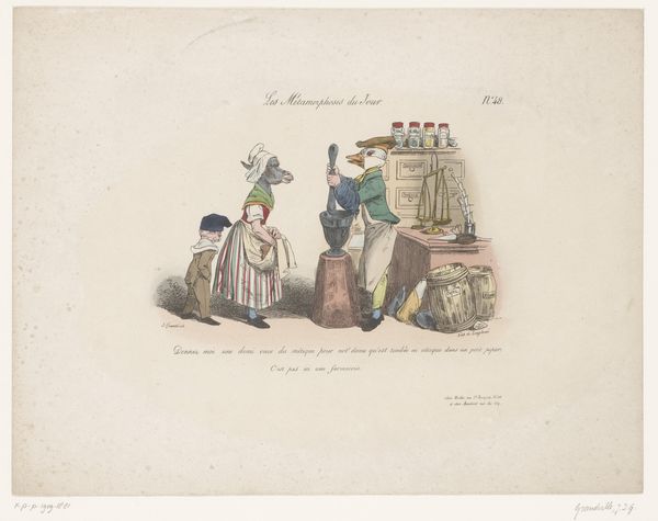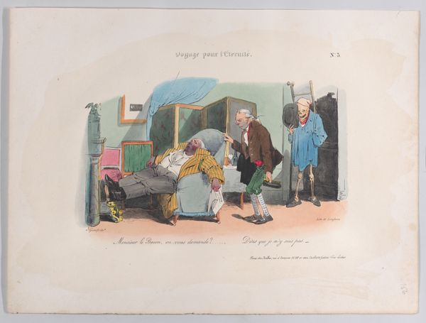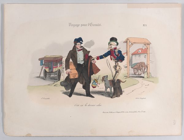 This caricature, "Old man is being fetched by Death as a traveler," was created by Jean Ignace Isidore Gérard Grandville in the 19th century. The composition is arranged around the stark contrast between the figures of Death and the old man, using color and form to emphasize their distinct roles. Death, depicted as a skeletal traveler, is rendered with precise lines, his hollow form draped in earthy tones. The old man is caught mid-action. The artist uses these figures to create a commentary on mortality. Grandville uses the semiotic language of his time to challenge fixed meanings of life and death. The visual elements – Death’s attire, the old man’s posture, and the arrangement of space – function not only aesthetically but also as a part of a larger cultural discourse on the human condition.