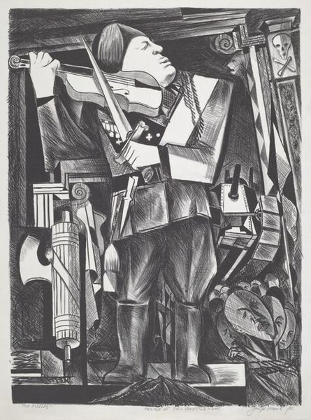 Curator: Let’s turn our attention to Joseph Wolins' “Chamber Music Group,” an ink and charcoal drawing completed in 1939. What strikes you first about this work? Editor: The energy—it feels like a spontaneous eruption of sound. There's a nervous, almost frenetic quality to the figures. Is that solely down to his expressive mark-making? Curator: Certainly, Wolins uses visible strokes to animate the composition. Note the layering of charcoal and ink washes, the strong contrast, the overall sense of volume. It is the tonality that achieves such arresting presence through a constant interplay of positive and negative shapes. Editor: But the subjects themselves – their vacant expressions. Is it merely coincidence, that we see them caught during the prelude to World War Two? The intensity you point to, but now viewed through this lens of impending violence, could be seen as a group coping with, or even oblivious to, social upheaval. Curator: I see what you mean, but wouldn’t it be rather reductive to constrain a discussion about such intricate work within a simple historical frame? Let's think about it less as an interpretation and more as a… performance of pictorial syntax. How would we interpret Wolins' disruption of perspective and flattening of space without invoking principles like structuralism or deconstruction? Editor: Maybe we can entertain both possibilities – artistic intention and its contextual reading? This ensemble seems trapped—confined not just within the frame but by the very act of creation during times of anxiety. They represent the anxiety of creation as well. Curator: Perhaps… there’s undeniably a potency to that idea. Editor: I see, and maybe it enriches your understanding of form, line, shape, to now think how each one relates, symbolizes. I'm still seeing anxiety; however, I also see defiance. Curator: Alright, alright, point taken. I can now appreciate your reading! In closing, viewing a work as complex and masterful as “Chamber Music Group” leaves one filled with the power of potential realities, both on the picture plane, and just beyond. Editor: Definitely. Thank you, Wolins, for prompting these conversations around social discord, cultural awareness and resistance.