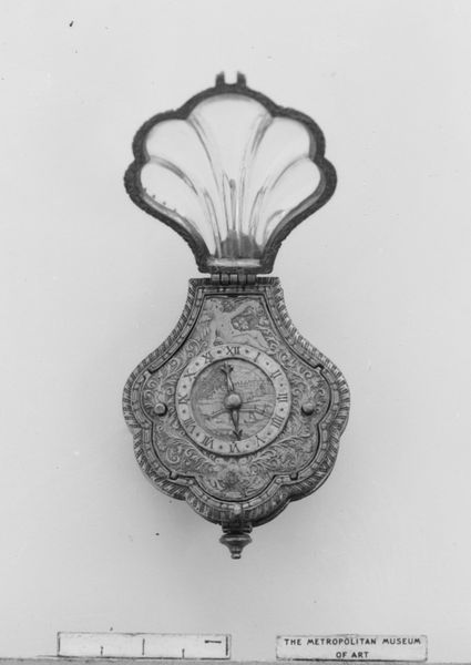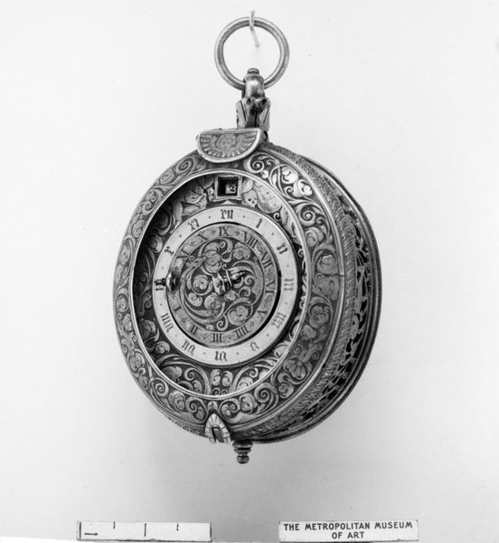 Editor: Here we have a Baroque watch, crafted in metal, around 1675 to 1685, by Pierre Derssigny. Looking at all the detail, it almost seems like the maker wanted to trap time, not tell it. What can you tell us about this piece? Curator: Time captured, exactly! Clocks have always been so much more than functional. Look at the engraved cherubs, the dense floral motifs… They aren't just decoration, they speak to the perceived qualities of the period. How do you interpret the balance between the mechanical aspect of the watch and these flourishes? Editor: It’s interesting. The flowers and cherubs feel light and joyful, but the actual function of a watch reminds us of our own mortality and passing time. Is that intentional, do you think? Curator: I think you're on to something. Baroque art often played with contrasts: life and death, sacred and profane. Think about the phrase "memento mori"—remember you must die. The beauty and detail could serve as a reminder to make the most of your fleeting time. Does that alter how you feel about it now? Editor: Absolutely, it feels much more profound than just a decorative object. All these details, hinting at a bigger picture...I'll never look at a watch the same way again! Curator: That's the magic of symbols. They condense complex ideas into accessible forms, inviting us to contemplate our place in the world. This small object is like a microcosm of the Baroque worldview.