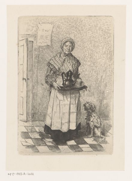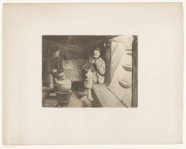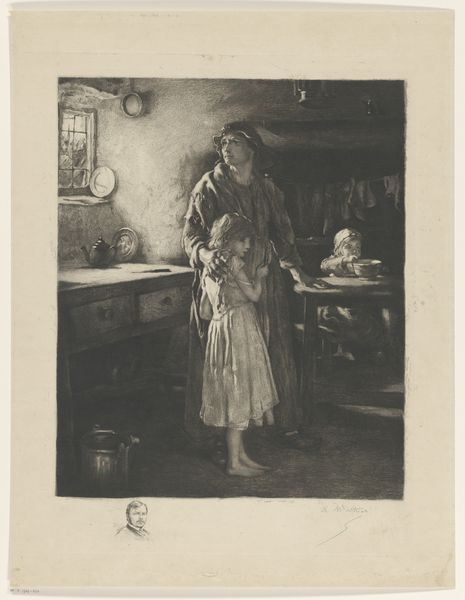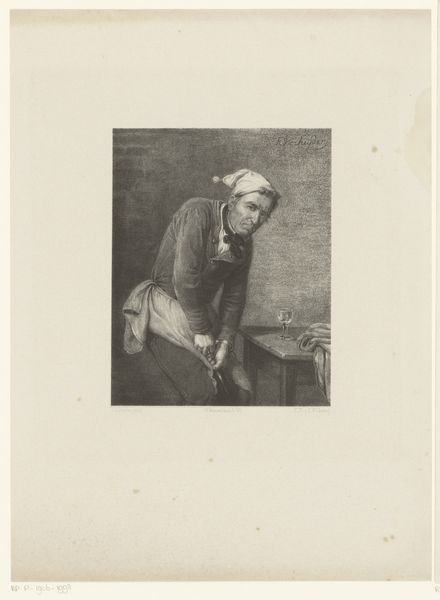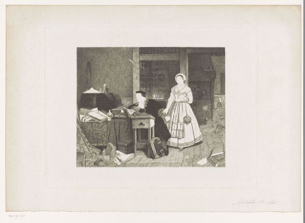 François Bonvin's print "La Sortie de Cave," presents an austere and shadowed domestic scene. The composition is dominated by the stark contrast between the dark interior and the figure of the maid, who is illuminated as she emerges from a cellar. Bonvin employs a rigorous formal approach, using the etching technique to create a dense network of lines that define the spatial environment and the play of light. This use of light and shadow not only models form but also serves a symbolic function, highlighting the social division between the unseen labor below and the visible world above. The print resonates with the Realist movement's concern for representing everyday life and the working class. Yet, by focusing on the formal qualities of the image—the balance of light and dark, the geometry of the architectural space, and the textured surfaces—Bonvin elevates the mundane to the level of high art. It asks us to consider how structure and form contribute to the social narratives embedded within the artwork.