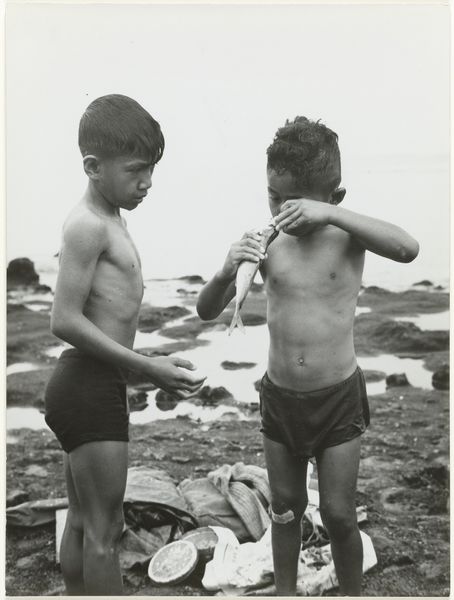 Curator: Well, this is a gritty little scene. It’s an untitled photograph by David Seymour, circa 1948. Look at these boys... caught in this in-between place. Editor: Right, I feel this in my bones. Something about the smoke and shadows, a fragile masculinity or something, mixed with that grainy film... there’s something painfully beautiful in it. It feels like childhood hanging on by a thread. Curator: Agreed. Seymour, working often with photojournalism collective Magnum, documented Europe after the war. The images weren't simply documents. Editor: Not at all! They tell the quiet stories. And in his capturing these boys smoking on what looks like stone steps...is it Italy?…there’s a sense of both bravado and vulnerability. You almost smell the cigarette smoke! Curator: Quite possibly Italy. He captured children in displaced persons camps, grappling with trauma. So we must ask ourselves, where did this cigarette come from? Scrounged? Bartered? The very material of the photograph makes the narrative tangible. What's for certain, it symbolizes their precarious existence in postwar Europe. Editor: Oh, completely, it is symbolic for a maturity thrust upon them. The lighting is intense, drawing our eye to their faces, their clothes, even the stone around them. You see it’s not a posed shot. I like the off-center composition—sort of raw, unplanned even! Which suggests the reality of the setting he captured here! A sort of, unvarnished slice-of-life quality. Curator: The image, beyond its documentary quality, uses tonal range to offer meaning, doesn't it? Look at the light, how it renders the textures, of skin and cheap cloth and of ancient stones. I suspect there's considerable labor involved in the material production of this photo, in its circulation even now. Editor: Yes! There is so much unsaid—which speaks volumes. Curator: It leaves us to reflect on the legacy of conflict and resilience, of course. But even of how we continue to create images that shape narratives and perpetuate myths about people, places, materials. Editor: So true. You leave the piece thinking what became of them, I mean truly became... and really... that is what great images do, isn't it?