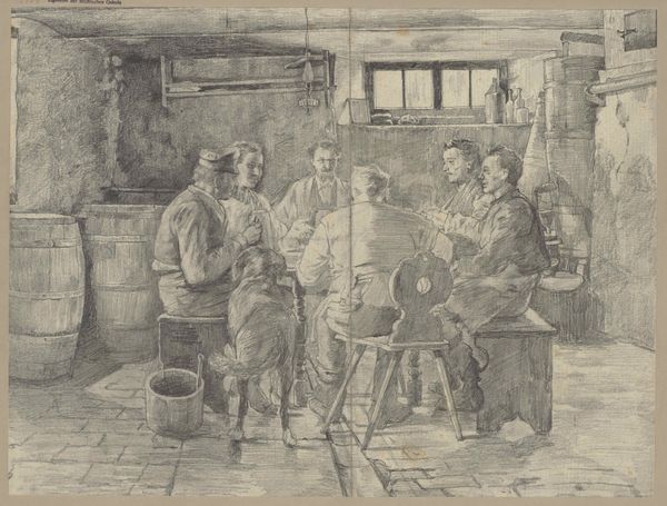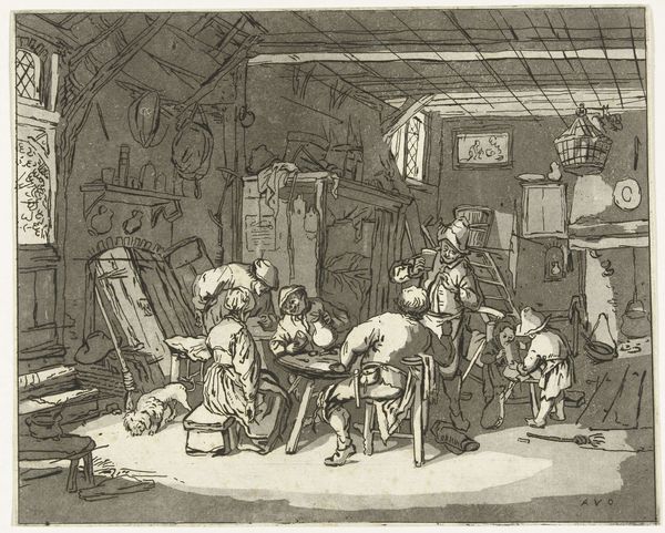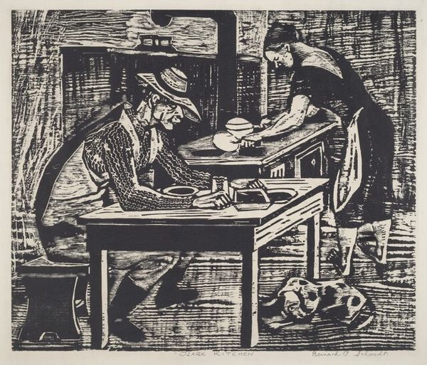 Curator: This is Jeannette Maxfield Lewis's 1934 print, "Abalone Pounders". Editor: It’s quite striking, a monochrome study of repetitive labor. The textures, even in this simple palette, seem almost palpable. The rhythmic arrangement of the figures really dominates the composition, doesn't it? Curator: Indeed. Lewis's work often depicted scenes of everyday life, particularly focusing on labor and industry. As you noticed, here we see women engaged in what was a common task at the time. It’s worth noting how her prints, engravings, and drawings provided a visual record of women's work and contributions to the Californian economy. Editor: I’m drawn to the geometric interplay. The squares and rectangles of the structures against the more organic, rounded shapes of the figures and tools. It creates a powerful visual contrast, a tension between the human element and the constructed environment. Semiotically, you could read it as a comment on the mechanization of labor… Curator: I find that a valid, if perhaps overstated, point. In reality, while she does showcase the uniformity and, dare I say, exploitation of such working conditions, I hesitate to overlay it with twenty-first century semiotics. Lewis seems intent on rendering the work and process rather than leveling judgements. The way the figures blend into the industrial architecture also highlights the reality of how people were integrated within these economies. It gives visibility. Editor: Still, that contrast is essential to understanding the visual and emotional impact. The limited tonal range reinforces the atmosphere of austerity and relentless routine. Curator: From a materialist perspective, we have to consider how printmaking itself allowed these images to circulate widely. This potentially democratized representation, enabling these images of women’s labor to reach wider audiences beyond the confines of the art world. Editor: Perhaps her dedication to depicting these subjects offers another layer of interpretation. We can see it both as observational recording but also a symbolic commentary on a very specific form of labor. Curator: So, reflecting on Lewis’s "Abalone Pounders," we find ourselves appreciating not just the aesthetics but its function as a mirror of societal values of the time. Editor: Yes, revealing complex layers of meaning embedded in this stark image. A successful blend of form and message, wouldn’t you say?