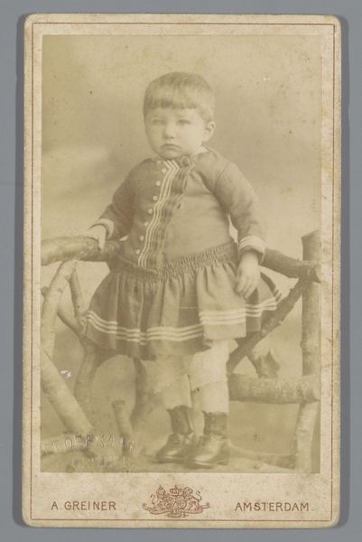 Curator: This is a photograph entitled "Model met geborduurde jas en muts van de Wiener Werkstätte," placing it sometime between 1920 and 1930. The work is housed here at the Rijksmuseum. Editor: There's something so delicately haunting about this image. It reminds me of a vintage doll, with its button eyes and a certain posed stillness. Curator: The subject here models clothing designed and produced by the Wiener Werkstätte, an association of visual artists, architects, and designers influential in the Art Nouveau movement. Consider this through the lens of design history. What can this image communicate to us about early twentieth-century aesthetics and class? Editor: Hmm, those patterned trims feel very handmade somehow, juxtaposed against the crisp, almost too-perfect presentation, especially those perfect shoes! It’s charming, though…makes me wonder about the little model. I hope their rabbit wasn't too ticklish! Curator: The Wiener Werkstätte aimed to integrate art into everyday life, promoting a unified artistic vision across all aspects of design. This child, adorned in bespoke attire, symbolizes a dedication to handcrafted luxury during a time of emerging industrialization. The context of early childhood portraits often intersected with statements about wealth, aspiration, and cultural values. Editor: And the teddy bear! Oh gosh, there's this wistful quality…the toy looking even more worn and loved against the clean backdrop… It tugs at something, you know? Did this feel as precious then, or does the passing of time turn it bittersweet? Curator: Exactly! Examining its photographic qualities – the soft sepia tones and meticulous staging – invites us to unpack prevailing beauty standards, power dynamics, and historical frameworks that shaped these visual representations. The image, in its gentle innocence, also silently highlights larger social inequalities. Who had the access, resources, and societal standing to participate in the lifestyle implied here? Editor: It also feels like they have captured something other than just finery, a tender moment… like they almost weren't ready, they caught her there not fully 'performing', and so maybe that's why this moment speaks through time with its little hand hugs and half smiles... Curator: That's an interesting point – seeing this image through a psychoanalytical frame brings in questions around affect, vulnerability, and desire, disrupting a potentially conservative read of wealth. The beauty and privilege become complicated… Editor: It leaves one lingering, right? Long after we wander into another room...a gentle reminder of worlds lived in. Curator: Agreed. A silent, beautiful photograph that encourages us to weave these threads of history, design, and affect into a nuanced appreciation.