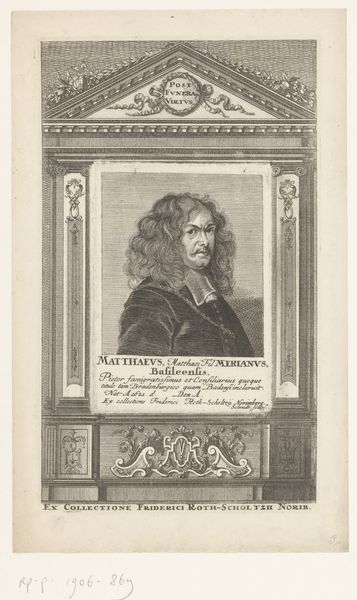 Editor: We're looking at "Portret van Johannes Peter Lotichius," a print made in 1635 by Sebastian Furck. The fine lines of the engraving give the portrait such a formal air. It seems like such a definitive and powerful portrayal. What do you see in this piece? Curator: Initially, the construction of pictorial space commands attention. Observe how Furck situates the figure within multiple frames: a trompe l'oeil stone surround, an ovoid border, and finally the edges of the print itself. This layering creates a sense of depth while simultaneously flattening the image. Notice too the play of light and shadow achieved through meticulous hatching and cross-hatching, particularly on the face and collar. How do these tonal variations contribute to the overall impression of the sitter? Editor: The dark lines really define his features, adding to that feeling of seriousness. But is there any other meaning? Is it just decorative? Curator: Decoration is intrinsic and meaning emerges from its composition. Furck is deliberate with detail – each line defines form and shape. The sharp contrast of dark and light creates a stark and unsparing, powerful portrait. Are you not struck by its commanding nature? Editor: I am now, I really was just focused on how good the engraving was before, the cross-hatching, but this layering of depth… And you’re right, there is such a finality, confidence in that gaze! Curator: Precisely. The piece encapsulates not only skill but is self-assured, much like the figure represented. Editor: Well, I certainly won’t look at another Baroque print the same way again! Curator: Nor I. This piece exemplifies how form itself can be a powerful means of conveying meaning.
