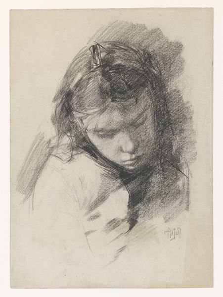 Editor: Here we have "Young Woman with a Headscarf, Face On, Head in Her Hands. Bust Portrait" by Frans Schwartz, likely created sometime between 1865 and 1917. It's an etching, giving it a delicate, almost vulnerable quality. There's a pensiveness in the subject's face; I wonder what she's thinking about. What do you see in this piece? Curator: Beyond the immediately visible pensiveness, I see a layered commentary on the social constraints placed upon women, even subtly. Her headscarf, while seemingly simple, marks her within a certain social sphere – potentially one of domesticity and restricted agency. The very act of supporting her head in her hands, while suggesting introspection, can also be interpreted as a sign of weariness, perhaps even resistance to those limitations. What does her closed-eyes posture communicate to you about the limited range of self-expression accessible to women of that era? Editor: I hadn't considered it as resistance, but that's an interesting perspective. It’s like she's retreating inward as a form of quiet rebellion. Are you suggesting that Schwartz was consciously using this image to critique those societal norms? Curator: Precisely. Remember, this period was rife with burgeoning feminist thought, and artists were often subtle mouthpieces for those emerging ideologies. The etching medium itself – often associated with intimate, domestic scenes – becomes a powerful vehicle for this subversive messaging. Can you imagine this image being exhibited in a space traditionally dominated by grand historical paintings, implicitly challenging the very definitions of power and representation? Editor: That's powerful! So, it’s not just a portrait of a young woman; it's a quiet statement about her place in the world and the potential for inner strength. Curator: Exactly. Art can act as both mirror and catalyst, reflecting the socio-political climate while simultaneously pushing for change, urging viewers to examine critically the narratives being presented and the ones being suppressed. Editor: I'll definitely look at portraits differently from now on, considering the layers of meaning embedded within them! Curator: And that's exactly the power of art – it invites us to engage with the world in a more nuanced and critically conscious way.