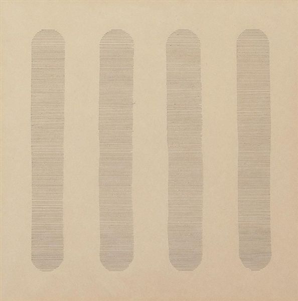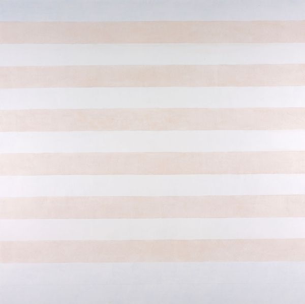 Curator: Here we have Agnes Martin's "Loving Love," created in 1999. What’s your first impression? Editor: Serenity. The pale washes of color create an incredibly calming effect. It's interesting how such simple geometry can evoke so much emotion. Curator: It's interesting to consider Agnes Martin’s commitment to abstraction as a conscious effort to create distance from societal constructs, especially given the highly gendered art world she navigated. Her retreat to New Mexico and embrace of quietude as an artistic philosophy also invite speculation. Were those artistic and lifestyle choices in some sense a feminist statement? Editor: Perhaps, but I’m drawn to the subtle tension between the regularity of the stripes and their very slight imperfections. Look closely, you’ll notice they’re not mechanically perfect. Those small variations introduce a crucial human element. It transcends mere geometric exercise, you know? It makes the grid breathe, which, counterintuitively, actually amplifies its feeling of serenity for me. Curator: It's compelling how Martin creates meaning through such minimal means. Consider the socio-political climate of the late 90s; hyper-consumerism and an increasing obsession with surface appearances. Is "Loving Love", created at the end of that decade, a commentary? A rebellion through quietness? The materiality too; these pale washes stand in stark contrast to much of the era’s bolder color palettes. Editor: I suppose the imperfections could symbolize a quiet rebellion as you suggest, but I also see it simply as integral to the grid itself. Take that element away, and it is easy for a painting like this to lose that vital human dimension. I believe her engagement with colour field painting is central. Curator: This has changed how I look at Martin’s color choices, as a conscious withdrawal from certain trends that may reflect broader artistic resistance to capitalist values. Editor: Exactly! And for me, it is further evidence that those very nuanced visual relationships create much of the artwork's gentle emotional depth.