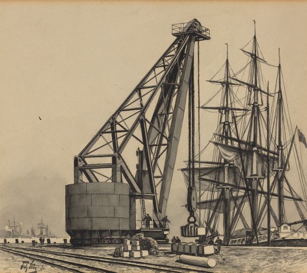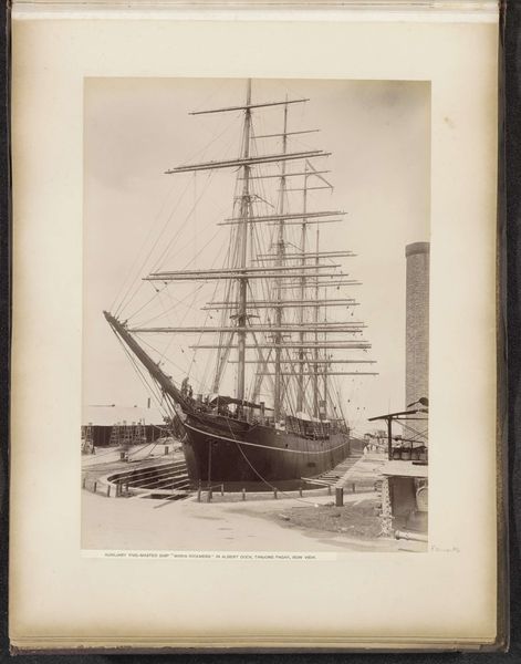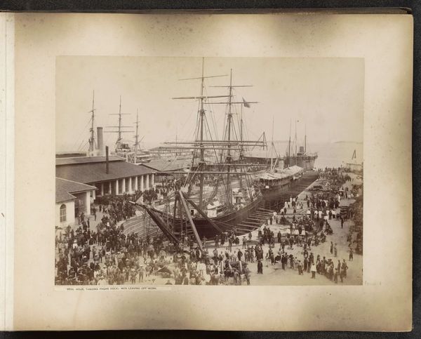 Curator: Before you is a photograph titled "Two German Warships with Crew in a Dock of the Tanjong Pagar Dock Co. Ltd. in Singapore," attributed to G.R. Lambert & Co. It's a gelatin silver print and thought to be made before 1905. Editor: Wow, it's busy, isn't it? All those sailors, the rigging... I'm immediately struck by the sense of industry and the slightly melancholic feel of monochrome. It feels like looking into a different world. Curator: Absolutely. Considering this was Singapore before 1905, situated within a complex matrix of colonial power and maritime trade routes, what can we infer about the role and significance of the German presence as captured in this landscape? Editor: That's heavy, but also true. The photograph romanticizes, perhaps. I keep thinking of these sailors on board; maybe longing for home, trapped in these political maneuverings. What does a common seaman think about grand geopolitical strategy, eh? Curator: Indeed. This piece invites contemplation on how identity, specifically national identity as signified by the warships, intersects with gender and class aboard ships of this scale, not merely on some generic idea of homeland and longing. We could usefully investigate the social strata aboard a vessel like this at this specific point in history. Editor: I never even thought of it that way! It feels so sterile now! Before I just thought of it as two warships and people in white uniforms, but they’re people! Ugh, the white uniforms. Curator: Indeed. Also, consider how the very act of photographing this scene becomes an act of documenting—or indeed participating in—the colonial project, potentially complicit in representing these ships, crew, and the broader port activity through a specific cultural lens. Editor: That's some great context to keep in mind. Looking at the masts and sails like this; they evoke this incredible mixture of technological mastery, industrial potential and… yeah, dominance. But like you say, also an entanglement with those wider social systems and historic wrongs. Okay, my head’s spinning, in a good way. Curator: Precisely. So, next time we engage with an artwork, this photograph reminds us of our capacity for deeper understanding, not only what is depicted, but what power dynamics it invokes. Editor: Definitely! I need to sit with all this, imagine stories beyond the immediate frame, and wrestle with this odd nostalgia the image gives me for something so steeped in inequality. Thanks, history!