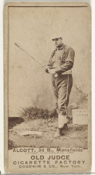 Curator: The figure in this card from Allen & Ginter's "Racing Colors of the World" series, printed around 1888, is strikingly direct. I’m immediately drawn to the colour scheme; that sharp red cap against the almost washy blue backdrop... very striking. Editor: It’s curious how this simple chromolithograph, intended as a commercial collectible with cigarettes, uses the conventions of portraiture to assert social status through colour and, frankly, conspicuous consumption. The flattening effect feels almost caricatured, which detracts from a serious engagement. Curator: Indeed, the flattening emphasizes its industrial, mass-produced nature; we should remember this wasn’t crafted as high art but as a disposable token associated with a consumer product, tobacco. It points to the commodification of leisure and the elite during that period. Think about who was consuming this! Editor: Though, the chromatic choices have a certain boldness. The blue and white bands on his shirt and the warm treatment of his complexion create a pleasing rhythm that complements his serious mien, lending it an immediate legibility and undeniable compositional charm despite being a print. Curator: Well, if we think about Allen & Ginter, it becomes clear that these cigarette cards reflect social values but also manufactured desire. It is the convergence of industrial printing technology with social signaling via commodities that elevates this little picture. It's all about distribution and the cultural reach of these tiny portraits. Editor: Even on close looking, the hatching employed in the colour blocks is readily appreciable despite its size, indicating the craftsman had a clear sense of value and hue that translated well into popular print for wide distribution. Curator: So, here we have it; a mass-produced print associated with cigarettes acting as a looking glass reflecting Victorian consumer culture and social ambition. A material artifact pregnant with meaning. Editor: I’ve observed how its very limitations—its print origin and commodified existence—nonetheless contain some intrinsic artistic flair within its presentation. It’s simple; it catches your eye and does its job, however humble that job may be.
