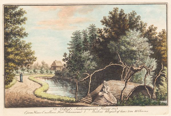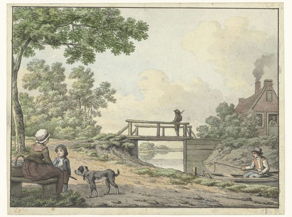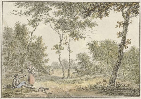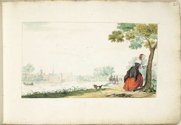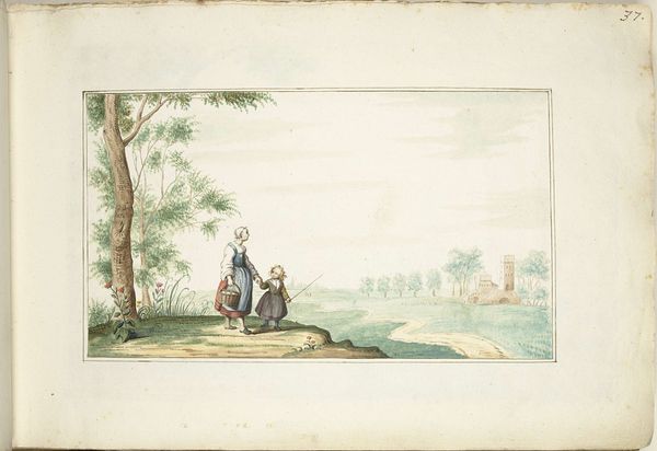 Gesina ter Borch created this watercolour, "Boerenvrouw en kind in een landschap", sometime in the 17th century. Ter Borch was from an artistic family in the Netherlands, and her work gives us a glimpse into the daily lives of ordinary people. The image shows a woman, probably a farmer's wife, and a child in a rural setting. In the background, we can see buildings, perhaps a church and houses. The Dutch Golden Age saw a rise in genre painting - scenes of everyday life. Artists like ter Borch found a market for images that reflected the values and experiences of the growing middle class. These paintings weren't just neutral records; they often carried moral messages or commented on social norms. To understand this image fully, we might want to research the clothing styles of the time, the role of women in Dutch society, and the economic conditions that shaped rural life. By looking at these kinds of sources, we can understand the artwork as something that’s deeply embedded in its time and place.