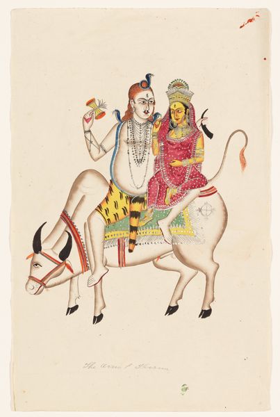 Curator: Welcome! We are standing before “Holding a Hookah,” a 19th-century watercolor portrait from an unknown artist, currently residing here at the Minneapolis Institute of Art. What’s catching your eye first about this piece? Editor: Honestly, it’s the figure’s slightly vacant expression coupled with the... meticulous detail in the hookah. There's an odd disconnect that gives it a somewhat unsettling feeling, doesn't it? Curator: It is a curious combination. Consider, though, that such paintings served distinct roles in their time. Many were produced for European patrons as representations—often stereotypical—of South Asian life. They weren’t necessarily intended as “high art” but rather as ethnographic documentation, reflecting colonial power dynamics. Editor: So the unsettling feeling may be because it perpetuates an imbalance of power, creating a caricatured representation of the sitter. The bright colours are really enticing, while it depicts something which, due to it's social context, can feel offensive to a contemporary audience. Curator: Precisely. The artist probably sought to appeal to European tastes. We see that influence reflected in what art historians often term 'Orientalism'. The detailed rendering of the hookah contrasts with the figure’s somewhat flattened, almost cartoonish face. Editor: Which begs the question of the artist’s intentions. Were they subtly critiquing the sitter, or were they simply conforming to what their patrons expected? There’s also that tattoo. Was it symbolic, or is it used here simply as a design element, fitting to the orientalist vision? Curator: It's hard to say definitively without more context about its origins, though in similar art commissioned at the time it does often reflect popular or imagined notions more than accurate portrayals. Art, like all cultural production, can be a mirror reflecting power dynamics, sometimes unintentionally. Editor: That's the crux of the issue. These portraits served not just as depictions but as vehicles for reinforcing perceptions about class, culture and even political structures. When viewed critically, “Holding a Hookah" isn't merely an aesthetic object, but a loaded one. Curator: Yes, and by investigating its role within this history we come closer to unpacking that weight. Editor: Indeed. Now, when I look at "Holding a Hookah," it feels a bit more transparent, revealing both the sitter and the societal context in which this watercolor came to be.