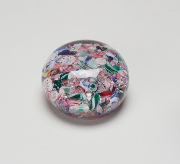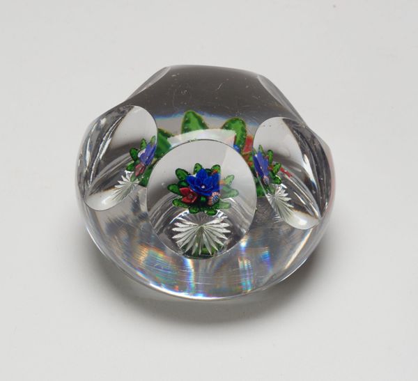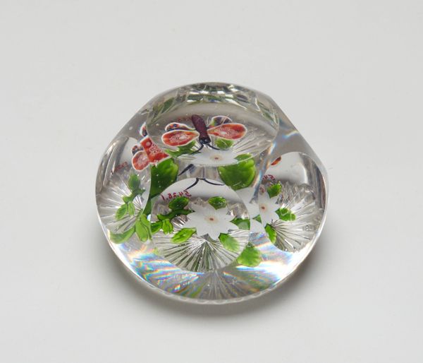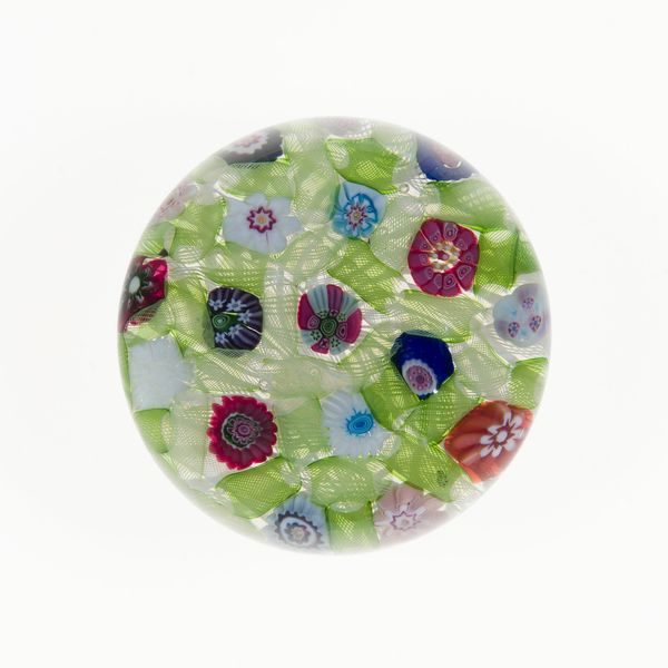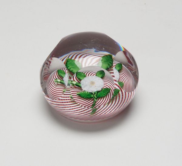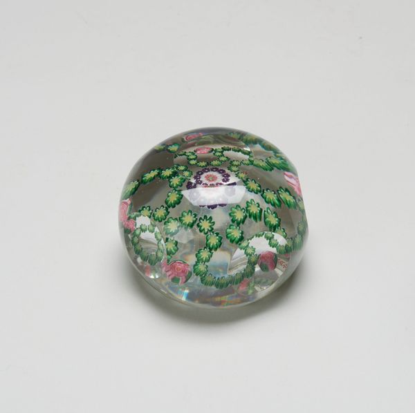 This paperweight was likely made in the 19th or early 20th century, by an anonymous glassmaker. The clear glass sphere encases a delicate floral arrangement. The technique involved is known as lampworking, where glass rods are heated and shaped with tools and a torch. This paperweight showcases the material's capacity for both optical clarity and intricate detail, with the flower's form rendered in precise detail. Consider the skill and labor involved in creating such a small object. Glassmaking has a long history, often involving highly specialized knowledge passed down through generations of artisans. While seemingly a humble object, paperweights like these reflect broader trends of industrial production and consumer culture, which made decorative objects accessible to a growing middle class. The value of such an object resides not only in its aesthetic appeal, but also in its demonstration of skilled handwork in an industrial age.