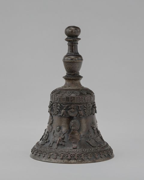 Curator: It breathes ancient stories doesn’t it? I am fascinated by this “Lamp Stand,” crafted in bronze sometime between 1592 and 1643 by Abdullah Haidar al-Husaini. The intricate carvings all over its surface seem to whisper secrets from centuries ago. Editor: It strikes me immediately as opulent, a sort of… functional treasure. You can almost feel the hand of the maker; bronze like this always screams materiality, the sheer process of shaping it, the social context that gave rise to the demand for it. Curator: The geometric patterns are almost hypnotic. They evoke a sense of serenity, of divine order. Each swirl, each meticulously carved detail reflects light in a dance only appreciated with candlelight flickering in a darkened chamber. It feels alive to me. Editor: And that’s precisely where its magic lies: in functionality meets pure aesthetics. We have a quotidian object raised to an artistic level via labor-intensive processes. Each mark left is the accumulation of choices, revealing an artisan community shaped by production and access to raw materials. Curator: Speaking of labor and processes: look closer. The bronze… It hints at so much more. The lamp represents not just illumination, but spiritual enlightenment. Do you feel it, this connection to the celestial? Editor: Indeed. But I would venture to push against romanticism—look closely. What at first looks like intricate floral flourishes gives away tiny, repetitious carvings suggesting division of labor. Consider the politics and economics necessary to make an item such as this. Curator: A valid observation. I hadn't thought of the workshops, or divisions of work, when considering this lamp. To imagine artisans sharing these refined skillsets reminds us how profoundly people can come together around artistry. And despite your challenge against it, there’s a palpable beauty radiating still from a distant past. Editor: Yes. It prompts a reevaluation, seeing how material means intertwine to elevate function into the decorative; blurring lines across labor, commodity, art, and the social hierarchies that enable all this. A powerful stand indeed.