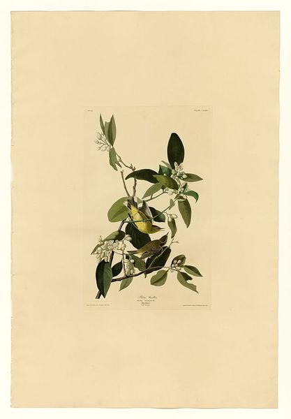 Editor: Here we have "Plate 144 Small Green Crested Flycatcher," attributed to John James Audubon; it looks like watercolor and some sort of drawing media on paper. There is a feeling of detailed observation combined with an almost idealized natural setting. What do you see in this piece from a historical point of view? Curator: Well, looking at Audubon, we need to think about the context of natural history illustration within a rapidly expanding nation. Works like these played a crucial role in shaping public perceptions of the American wilderness. Audubon's work contributed significantly to the romanticized image of untamed landscapes that fueled both national pride and, paradoxically, environmental exploitation. Editor: Exploitation? I see pretty birds! Curator: Consider how these images, seemingly benign representations of nature, functioned in a society grappling with westward expansion and industrialization. By depicting these birds with such detail and, some might argue, affection, Audubon's images fostered a sense of ownership and control over the natural world, legitimizing its appropriation for economic gain. What impact do you think it had at the time, to see birds documented in this way? Editor: Hmm, I guess people would feel more connected to these birds by knowing what they looked like. It brings nature to them, so that they'd care if they vanished. So this kind of scientific documentation, could be helpful for both conservation and consumption? Curator: Exactly! The image could also create distance through knowledge, so nature can become an object to study, to name, and ultimately, to commodify. Audubon's project was ambitious. His illustrations naturalize a developing economic landscape and a culture being driven to remake itself. Editor: It is fascinating how an image can be both beautiful and carry a political and historical burden. I learned a lot thinking about its purpose back in the day! Curator: Likewise. Considering the political ramifications has given me some new ways of appreciating this artwork!