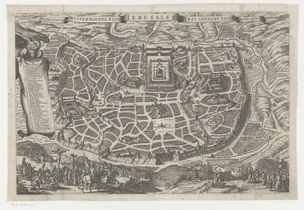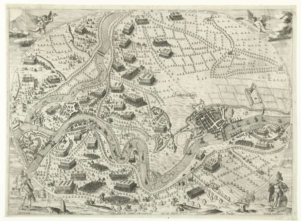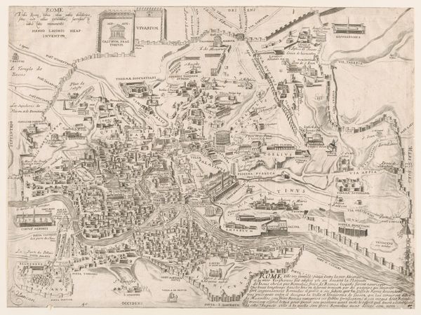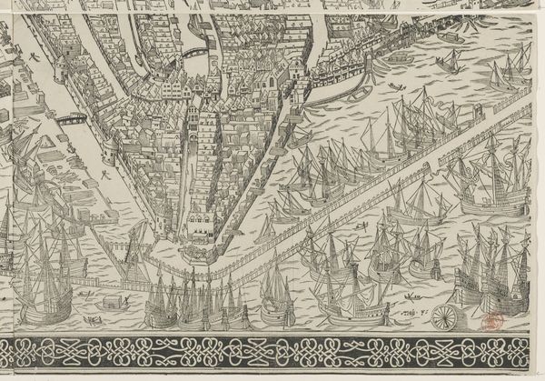 Editor: This is "Kort over Paris," a woodcut drawing of Paris created around 1548 or 1549 by Hans Rudolf Manuel Deutsch. The incredibly detailed lines constructing this city suggest so much—growth, movement, organization. It’s both incredibly intricate and gives the impression of a planned urban design. What stands out to you in this piece? Curator: The symbolic language employed here speaks volumes, doesn't it? Notice how the river, Seine, bifurcates the city, acting as both a life source and a dividing line. Rivers often represented fluidity and change, the ever-moving force of time. Does this division also hint at social strata, perhaps the wealthy versus the working class, existing on opposing banks? Editor: That's fascinating, I hadn’t considered the social aspect of the river's placement. It’s interesting to think that a natural element could symbolize division. Curator: Indeed. And observe how the artist uses perspective, not perfectly, mind you, but aspirationally. The higher vantage point implies power, control, and an ambition to understand the entirety of the subject, like a god looking down on humanity. What psychological impact might that have had on viewers then, and perhaps even now? Editor: So the visual language works on multiple levels. I'm learning that there's so much more to it than just the image itself. It makes you wonder, what stories do you think this city, seen from above, wanted to tell? Curator: Perhaps a story of human ingenuity, our ability to order and contain the natural world. The image acts as a powerful statement of intent, encapsulating ambition, order and human domination. I never quite considered it from that view point. Thank you!