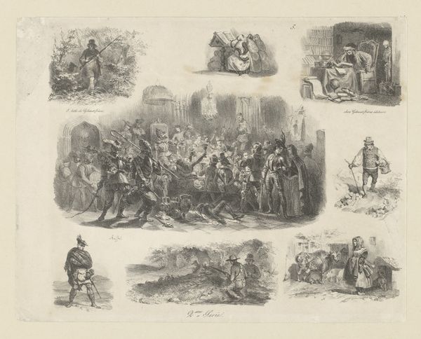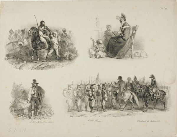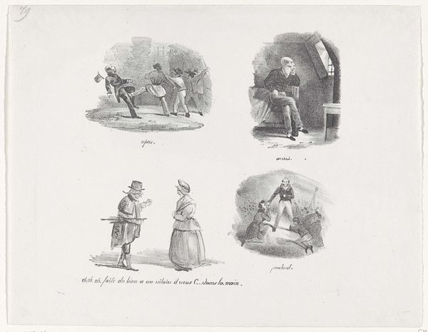 Curator: This is "Six Representations of Various Figures" by Hippolyte Bellangé, created sometime between 1818 and 1852. It’s currently held in the Rijksmuseum. Editor: It has a definite storytelling vibe, almost like panels in a graphic novel or a collection of quick character studies. There's a range of social classes depicted, and it's striking how the artist captures such distinct moods. Curator: Precisely! The lithographic process Bellangé employed allowed for the creation of multiple impressions, making art accessible to a wider audience during a time of significant social and political upheaval. Lithography enabled a certain looseness and speed, different from engraving. We are seeing him test the possibilities. Editor: Absolutely. Think about how the artist renders the costumes; you see markers of status, profession, region, and belonging. In essence, it’s a social record. And the solitary figures especially trigger so many questions, even beyond the individual narratives of each sketch. How can we trace the emergence of the bourgeois self through fashion, portraiture, and printmaking practices like these? Curator: We should also consider the market for these prints. They likely circulated amongst a growing middle class eager to consume images of their world, as well as images of other classes. There's the soldier, possibly connected to France's imperial ambitions, rendered next to a sketch that portrays poverty with the older, resting man. Editor: The romantic undertones give each figure a dramatic flair. And consider the positioning: they seem caught in between different planes of reality or possibility, but each plane represents its own distinct place in French society at that moment in time. I keep returning to that woman on the bottom, hooded: what can she tell us? Curator: It would be great to see the artist’s source material to uncover those relationships! Still, I appreciate your insight into that period as captured here; the range of subject matters provides access to a slice of life from 19th century Holland. Editor: And hopefully these sketches inspire some modern storytelling too!