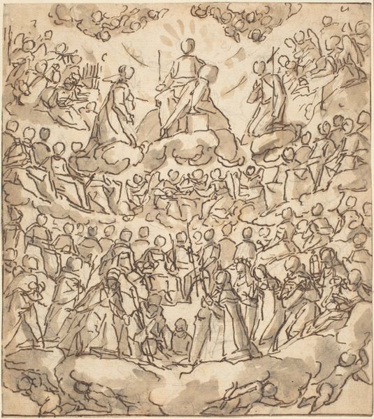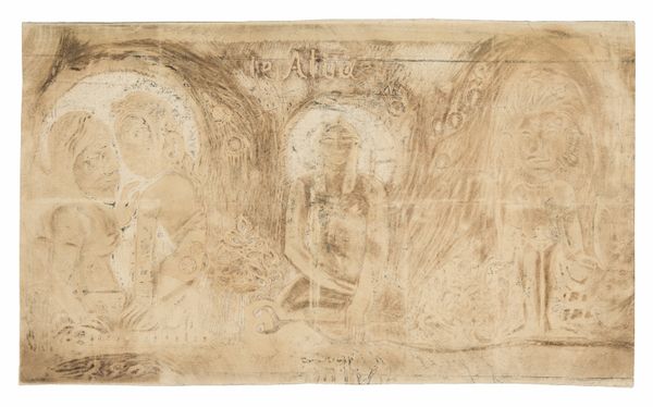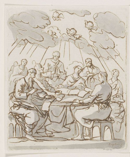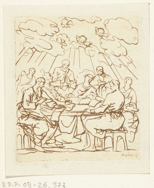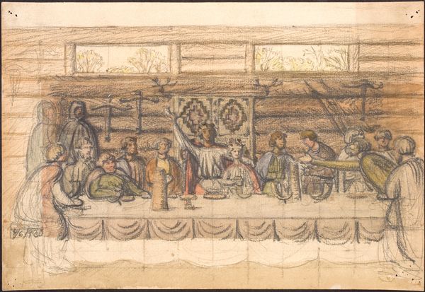 Curator: James Ensor created this piece, “The Last Supper,” in 1921, using a mix of media, including pencil, pastel, and ink, in a print form. Editor: It’s remarkably ethereal, almost like a memory fading. The soft pastel colors give it this delicate, dreamlike quality. Curator: Absolutely, the symbolism here is profound. Ensor revisits a seminal scene of Western religious iconography. But what is revealed? This feels like a vision distorted through time. Notice how the figures seem caught between the earthly and the divine, accentuated by that sun-like halo emanating behind Christ. Editor: And it's all rendered with such tactile materials! The texture of the paper comes through; you can practically feel the individual strokes of the pencil and pastel. It makes me think about the physicality of belief, how it's grounded in everyday experience and labor. Curator: Indeed. Consider the placement of Christ in the center; Ensor uses the iconography to evoke empathy. I am compelled to ponder, what aspects of the original narrative is Ensor pointing out, and how are the print materials assisting this emotionality? Editor: The looseness of the line work undermines any sense of divine authority. See those animals underneath the table. Ensor's hand is so present; the labor of making is so apparent that the spiritual content almost seems beside the point. It's all about the earthly process of creation. Curator: A provocative notion! The materiality serves the message, doesn’t negate it. Think of how the light plays in this composition, reminiscent of stained glass and spirituality and of higher understanding that transcends pure logic. Editor: So much weight is assigned to the labor of art, often without examining its effect on artistic symbolism! If those animals, created using the very same pencils, are any indication, I think the real message of the material labor of art takes center stage. Curator: Food for thought! Ensor has a knack for layering symbolic weight into seemingly simple drawings, inviting us to reconsider not just the scene but its enduring significance. Editor: And he makes us consider the very physical act of making that imagery, reminding us that these narratives are built and disseminated by human hands, human choices, human labor.
