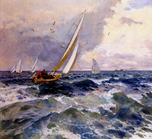 Arthur Lismer made *Minesweepers, Halifax* in oil paint, with a brushy technique that feels immediate and in-the-moment. Lismer's sea is a symphony of blues and greens, each stroke a deliberate choice, building up a surface that almost moves. The waves churn and break with visible energy. It’s a textured field – you can almost feel the salt spray. Look up to the sky, the yellows and blues are less turbulent, but still active, a painted contrast to the ship bravely heading into the unknown. The smoke billowing out the ship is a thick grey plume. It's rendered with heavy impasto, giving a physical weight to the ephemeral cloud. This reminds me of Courbet, who wasn't afraid to load paint onto the canvas, creating a sense of raw, unfiltered reality. Ultimately, *Minesweepers, Halifax* is about the process of seeing and feeling, reminding us that art is as much about the journey as the destination.