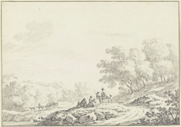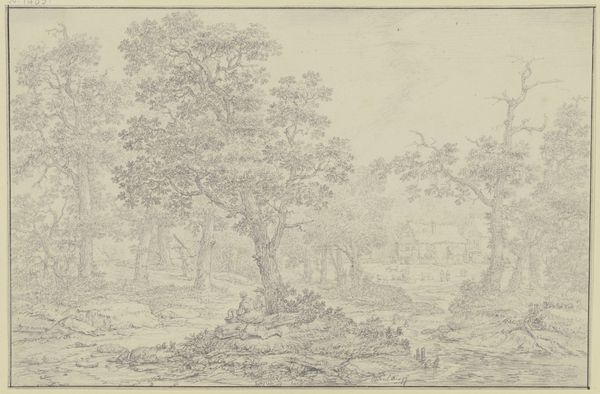 Hendrik Chalon rendered this landscape scene with graphite, depicting a serene countryside. See how the group of figures cluster together, an archetype of human connection. This image is a powerful emblem of community, echoing the classical ideals of harmony and shared experience. From ancient Roman frescoes depicting gatherings in idyllic settings to Renaissance paintings celebrating communal feasts, we see this motif recurring across centuries. Note how this symbol reappears in different guises. Here, it is secular and serene. However, the human psyche remembers archetypes: we look back to shared stories, such as the Last Supper. The placement of the group near what seems to be a humble dwelling evokes notions of shelter and belonging. Consider how we have collectively used images of people to express our deepest emotional states. Images such as these invoke feelings of warmth and empathy. The archetype of human communion continues to resonate, adapting to new cultural contexts and echoing through the corridors of time.
