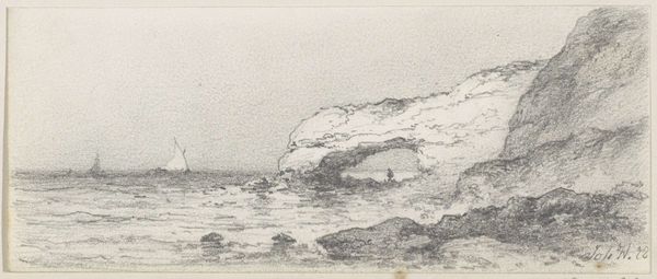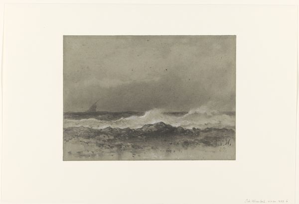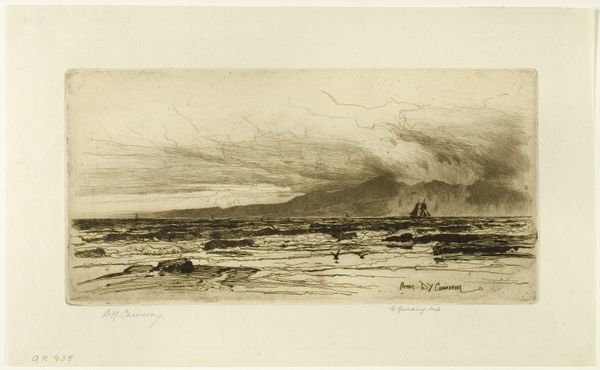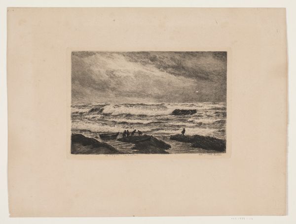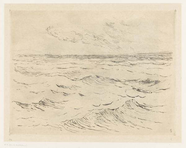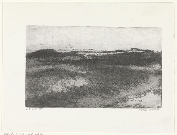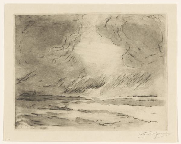 This is 'Hazenjacht,' an etching by Johannes Tavenraat. The print is dominated by a stark contrast between light and shadow. The upper portion is consumed by a dark, textured sky, pressing down on the frantic scene below. Our eyes are drawn to the lower register, where hares flee from pursuing dogs. Tavenraat masterfully uses the etching technique to create a sense of urgency. The lines are sharp and dynamic, conveying the speed of the chase, and the landscape is only barely suggested to give it a greater sense of speed. The composition is divided horizontally. The dark sky is a heavy, looming presence, while the lower half is filled with the frenetic energy of the hunt. This division emphasizes the vulnerability of the hares and the impending threat. The absence of color focuses our attention on the play of light and shadow, enhancing the dramatic tension. The artist uses these contrasts to underscore the precarious balance between predator and prey.