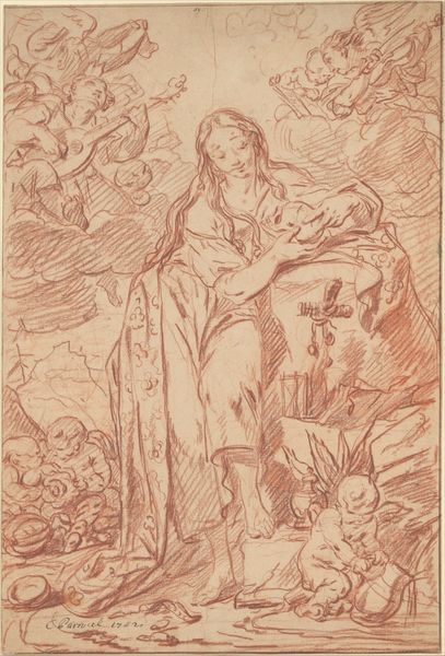 Giulio Carpioni created this drawing of a guardian angel leading a child in the 17th century. The angel, winged and draped in classical garb, is the dominant figure, holding the child’s hand, guiding the child into the unknown. This motif of divine guidance appears across cultures and eras. We see echoes of Hermes Psychopompos, guiding souls in antiquity, or even the protective embrace of a mother goddess, tracing back to ancient fertility figures. The angel's outstretched hand is also telling. It's a gesture that has been repeated throughout art history, from religious paintings signaling divine intervention to secular works expressing leadership and hope. Consider how the protective gesture evokes primal emotions—the longing for safety, the comfort of guidance. The image touches on our collective memories of seeking protection and reassurance, a psychological need as relevant today as it was centuries ago. The angel’s protective stance embodies not just religious faith but a universal desire for safety, a desire which endlessly resurfaces in art.