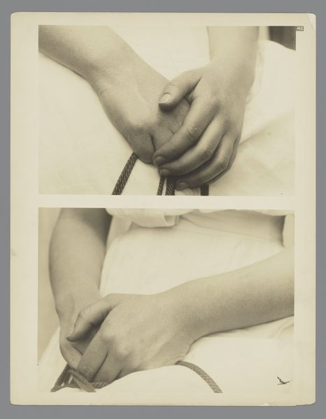 Curator: Elina Brotherus' photograph, "Fingernails," created in 2015, offers us a curious portrait through the singular lens of hands and nails. The composition immediately evokes a sense of intimate domesticity. Editor: Yes, there’s a certain vulnerability in this close-up of aging hands against denim—hands that are no longer conventionally beautiful yet speak to a lived experience, defying the airbrushed, manicured expectations often placed on women. Curator: Indeed. I am drawn to the contrasting textures—the lines and delicate topography of the skin against the smooth plane of the painted nails, little points of bright azure. It’s an interesting dialogue between the organic and the artificial. Editor: Absolutely, and the bold choice of the blue polish against the skin tones challenges beauty norms head on. It’s as if the artist is making a statement about self-expression, about choosing to adorn oneself, despite the inevitable march of time, and celebrating the labor performed by the hands, tools for making change. It reflects ideas in feminist aging studies, that emphasize aging women’s resilience. Curator: From a formal perspective, note how the asymmetry of the hands—one adorned with a wedding band, the other bare—creates a visual imbalance, unsettling any conventional reading of beauty or domestic bliss. This forces us to closely examine our aesthetic assumptions. Editor: Precisely! That one gleaming band shines as a testament to a commitment— perhaps highlighting not only matrimonial bonds, but a personal covenant to remain visible, valued, and vibrant in a culture that tends to marginalize older women, choosing visibility. Curator: It certainly subverts our gaze. Focusing on just the hands makes you rethink portraiture conventions, offering a statement that refuses to provide easy answers or standard visual pleasure. Editor: A thought-provoking defiance. It is also an evocative composition and its resistance to being neatly defined grants its power, particularly regarding identity and aging. Curator: Ultimately, this artwork shows us a great way in which beauty can arise from what culture overlooks or discards. Editor: This resonates deeply. We often discard those aspects of life that should in fact be considered worth celebrating and documenting, and this image reminds us that age is a precious subject to be appreciated in artistic expression.