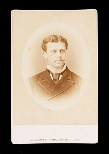 Curator: This is a portrait of Richard Montague, dating to around 1895, by William Notman. It's a small albumen print, a very common photographic process at the time. Editor: The sepia tones lend it a feeling of serious formality, almost austere in its presentation of upper-class masculinity. Curator: Precisely. Notman's studio was known for its efficient, almost industrial approach to portraiture. He streamlined the process, creating these affordable yet dignified images for a burgeoning middle class. Editor: It’s fascinating how these portraits, seemingly ubiquitous, served to solidify social hierarchies, visually reinforcing notions of respectability and success, especially related to the industrial-era gender dynamics. Curator: Absolutely. The repetitive nature of production and consumption speaks to the standardization of identity itself through material culture. Editor: It also makes me consider who could afford a portrait like this, and who was excluded from this type of visual representation. Curator: A crucial point to consider! The act of being portrayed was far from a universal experience. Editor: It’s a thought-provoking window into that era. Curator: Indeed, a seemingly simple image, yet rich with socio-economic information.