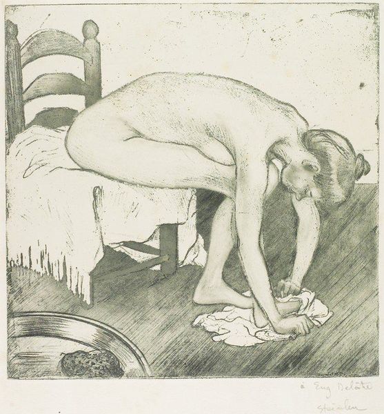 Curator: Here we have Edgar Degas' "The Tub", from 1886, a pastel drawing currently residing at the Musée d'Orsay in Paris. Editor: Mmm, pastels. Instantly makes me think of breath on glass. It’s intimate, but in a slightly…observational way? Like peeking through a keyhole. Curator: Exactly! This piece is exemplary of Degas' engagement with intimism, turning away from grand narratives toward capturing candid, private moments of modern life. The unusual perspective, looking down into the tub, really flattens the space. Editor: It’s all lines, isn't it? The table edge slicing through the scene, the curve of the tub mirroring her body… there’s a deliberate geometry happening, almost fighting against the softness of the pastel. And the composition's off-kilter in a way that feels modern. Like, reality isn’t always perfectly centered. Curator: Absolutely. Consider that Degas exhibited this pastel alongside a larger series of bathing women at the eighth Impressionist exhibition. These works were rather provocative in their own time for their direct and unsentimental depiction of the female body. He challenged academic traditions of the nude. Editor: It’s a far cry from those reclining Venuses we are used to seeing. There’s such a lack of idealization – that slouch, the awkward angle… she could be anyone. She is fully unglorified, but beautifully so. It reminds us of mortality, perhaps. Curator: Some critics see the work as symptomatic of the period’s fascination with documenting modernity but from a highly gendered and classed perspective. This brings up significant issues about how women's bodies have been visualized. But regardless, it's quite clear he was deeply engaged in representing the female form through the prism of contemporary life. Editor: He gets a little too close to comfort for me. Though it also reminds me to celebrate the fleeting details in my life. Maybe it’s just me trying to excuse a voyeuristic gaze. Either way, "The Tub" has me contemplating both art history and my own routine tonight. Curator: It definitely encapsulates the complex relationship between art and observation, then. Degas forces us to question what it means to be a viewer and what the ethical responsibilities of representation are. A thought-provoking slice of fin-de-siècle Paris!