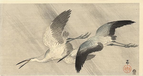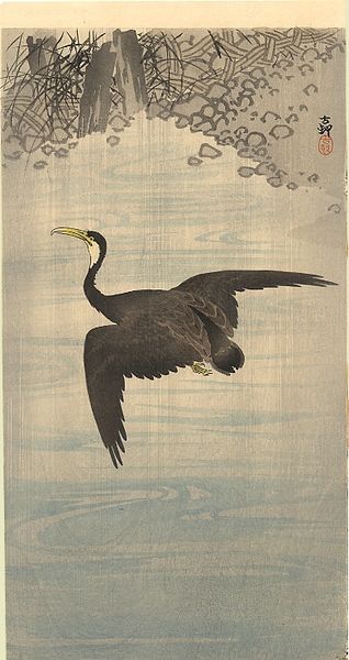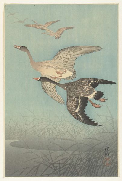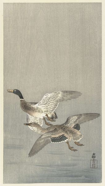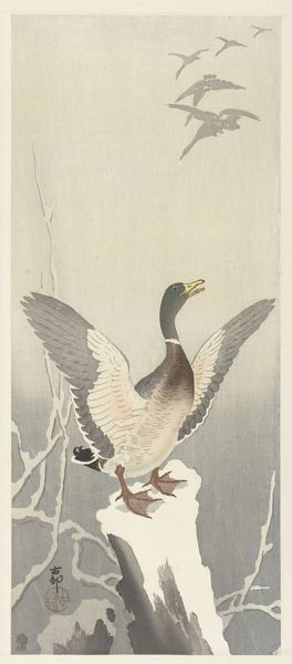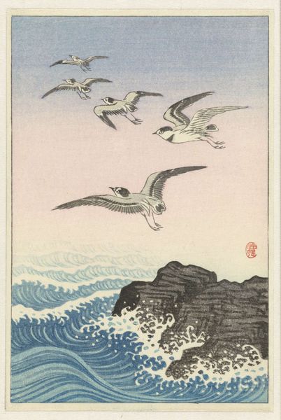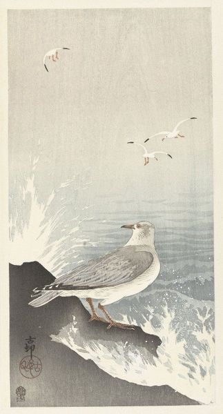Editor: This woodblock print, *Roodmaskeraalscholver op rots*, or Red-faced Cormorant on a Rock, is by Ohara Koson, sometime between 1900 and 1936. There’s this powerful presence, a stark silhouette against a stormy sea. I’m intrigued by how a few colours and lines manage to convey so much drama and isolation. What do you see in it? Curator: Ah, Koson! He had an exceptional talent for capturing the essence of nature, didn’t he? It’s more than just a pretty bird; it feels almost like a haiku translated into a visual form. I imagine Koson observing the cormorant, really *feeling* the bird's connection to its environment. You know, those rough brushstrokes mimicking the crashing waves, the almost aggressive stance of the bird. Have you ever felt that pull between wanting to brave the storm and needing solid ground? Editor: That push and pull is so tangible here! I love your haiku analogy! Do you think he chose a cormorant specifically because of its association with resilience, weathering harsh environments and still managing to thrive? Curator: Absolutely! Birds often symbolize freedom, and this cormorant seems like a rugged individualist refusing to be swept away. Look at how the other two seem more ethereal. Koson seems to be whispering to us that strength isn’t about being immune to the storm; it’s about finding your footing amidst it. This cormorant is rooted but also ready to take off at any moment. I wonder where it’s flying to next? Editor: Thinking about it, the artist creates this sense of tension between the sea and sky. I never thought I could find that much depth from a bird print. Curator: Exactly! The image invites contemplation of the fragile balance between permanence and change, resilience and vulnerability. Perhaps that's the magic trick with Koson. It certainly is magic.