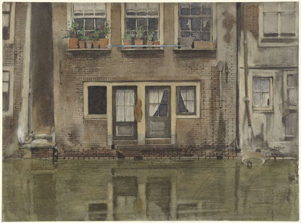Curator: Editor: This watercolor by Willem Witsen, titled "De Kromboomsloot te Amsterdam," painted sometime between 1870 and 1919, has a quiet, almost melancholic feel. What do you see in this piece? Curator: It's a powerful depiction of urban life, isn’t it? Beyond the surface, I see commentary on class and visibility. Notice the figures partially obscured, the woman in the doorway, another in the window, framed but separated. How do these visual barriers reflect social realities? Editor: I hadn’t thought about it that way. They seem almost trapped by the architecture. Curator: Precisely. The buildings aren't just background; they're actively shaping the inhabitants' lives and dictating their interactions, or lack thereof. Consider, too, the role of public versus private space in 19th-century Amsterdam. Where does one's identity reside? Editor: I suppose at that time, class dictated access to privacy in the domestic space? The composition does create an opposition between the architecture and the inhabitants’ experience of it. Curator: Indeed. Witsen prompts us to examine how power structures permeate the most intimate aspects of life. What about the animal figures: what role do they play here? Editor: I suppose the seagulls and dog offer more freedom? A break from the architecture perhaps. Curator: That’s it. The birds are outside the physical constrictions placed on humans in the scene. Editor: Seeing the figures this way definitely shifts my understanding of the work. Curator: These shifts are key to engaging with the artwork. There is a narrative weaved between public and private that echoes still today.