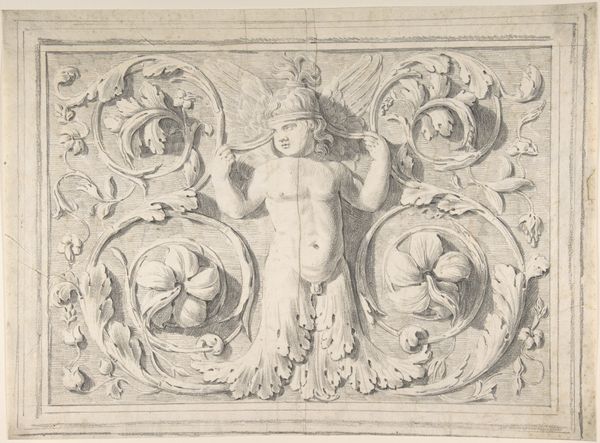 This pen and ink drawing, titled "Grotesque with a Bacchus Fountain Placed in an Architectural Structure," presents a symmetrical arrangement of fantastical motifs. The architectural elements frame a central fountain, creating a balanced composition. The limited use of grey wash emphasizes the linear qualities of the drawing. Note how the anonymous artist employs grotesque figures, such as the hybrid creatures at the base, to destabilize classical ideals of beauty. The Bacchus fountain becomes a focal point, challenging fixed meanings of purity and form. These visual components and cultural codes may have informed the artwork's making and reception. Observe the elaborate details and how they engage with new ways of thinking about space, perception, and representation. The drawing invites ongoing interpretation, reflecting the era's fascination with the grotesque as a means to question established norms.