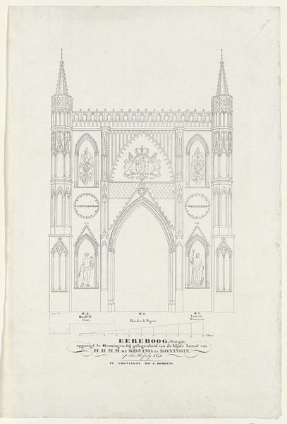 Editor: This is "Ereboog opgericht bij het bezoek van de koning en koningin aan Groningen, 1841" by Jan Oomkens. It’s from 1841 and is currently held at the Rijksmuseum. It appears to be a preparatory drawing or engraving design. I’m struck by its almost obsessive level of architectural detail...it feels very formal. What do you make of it? Curator: Indeed. Looking at this elaborate archway design, we can ask ourselves what such a structure represents in its historical context. Think about power dynamics at play during royal visits in the 19th century. How does architecture function as a tool to both celebrate and subtly reinforce the authority of the monarchy? What statement is made when royal visits are accompanied by temporary architectures like this? Editor: That’s fascinating. I hadn’t considered it beyond mere celebration. So, you’re suggesting the arch isn’t just decorative, but actively participates in reinforcing a social order? Curator: Precisely. Consider the symbolism embedded within the arch - the heraldry, the carefully planned vistas. These weren't accidental choices. Every detail, from the height of the arch to the placement of national emblems, contributed to a carefully constructed message about the relationship between the monarchy and the citizens of Groningen. Why design a *temporary* architecture instead of improving infrastructure for citizens? Who benefits, and who is othered? Editor: I see it now! The impermanence almost emphasizes that the power structure is timeless and doesn’t need a *permanent* marker. Like, the kingdom is already here; it doesn't need a stone monument. Curator: Exactly! The design speaks volumes about 19th-century Dutch society and how carefully public image and power were intertwined, then and now. This invites reflection on how contemporary political performances also rely on similar techniques of spatial control and visual symbolism. Editor: Thanks so much! I never would have considered that without your insights. I’ll definitely view similar pieces through a different lens going forward.