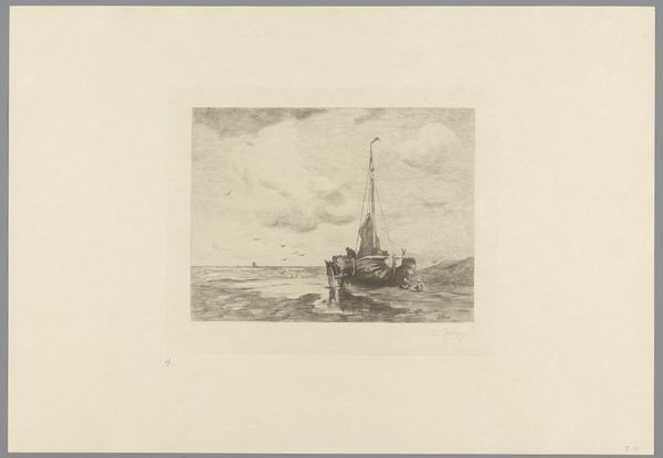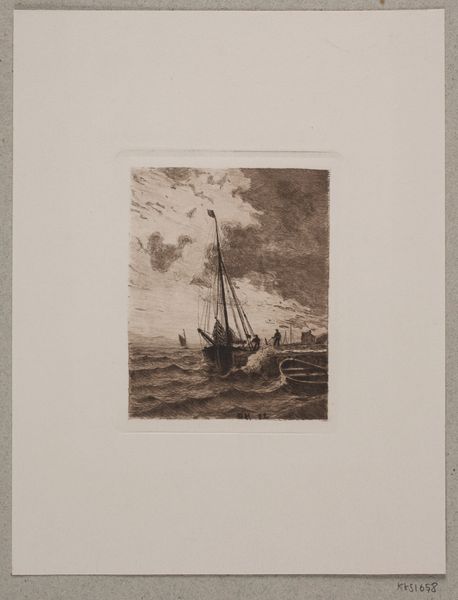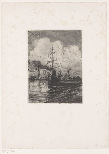 Editor: This is Albert Jan Oudshoorn's "Afgemeerde zeilschepen bij een kade," an etching made sometime between 1887 and 1930. The boats give me a sense of stillness, a quiet harbor scene. What draws your eye in this print? Curator: The masts, undoubtedly. They're attenuated fingers reaching for something beyond the visible, towards the divine or, perhaps, simply the promise of open water. Notice how they’re echoed by the subtle suggestion of masts further in the distance? That layering reinforces the psychological effect: a yearning, a reaching, but also a deep connection to place. Editor: That’s interesting, I hadn’t thought about the emotional weight of the masts. It felt very matter-of-fact to me, almost journalistic. Curator: Consider how Oudshoorn employs the linear style, mimicking realism. Do you see how he captures the texture of the weathered wood, not merely depicting boats, but vessels worn by experience? Ships in harbors are transitionary spaces of waiting. They invoke themes of arrival, return, trade, and transformation. What do these themes awaken for you? Editor: Hmm, that makes me see them in a different light – not just objects but carriers of history. Curator: Precisely. Each mark contains a memory, a potential voyage, making this simple etching a profound contemplation on time and human endeavor. What can we learn from things left in place, and do we value their history or potential? Editor: It's amazing how much narrative can be packed into a seemingly simple landscape. I definitely have a new appreciation for etchings now. Curator: Indeed. And perhaps a reminder that stillness itself can be profoundly symbolic.
